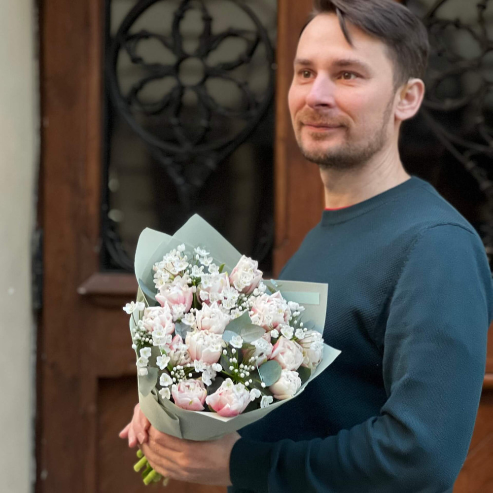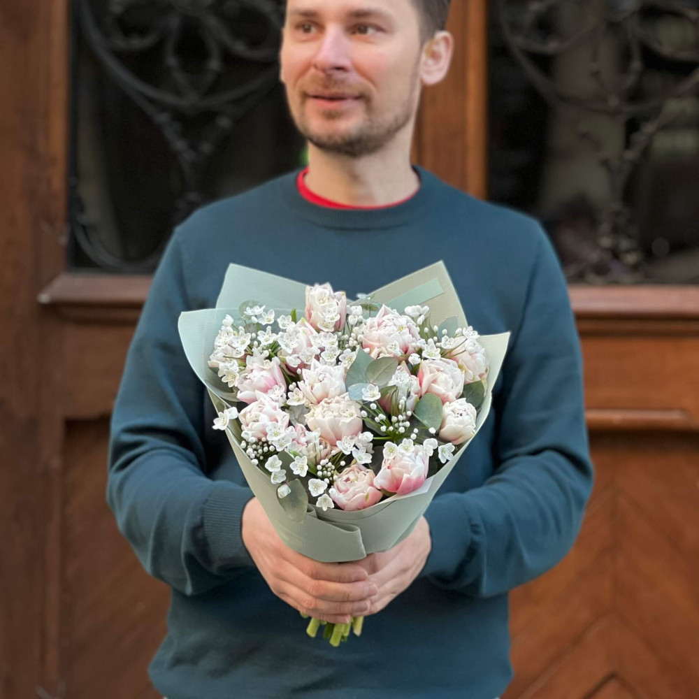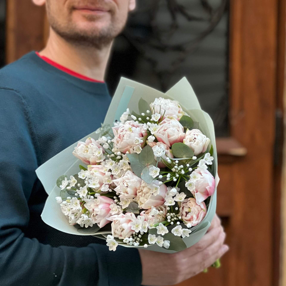 - Як замовити Букет з тюльпанів та алліумів «Полуничне мереживо»? ❯