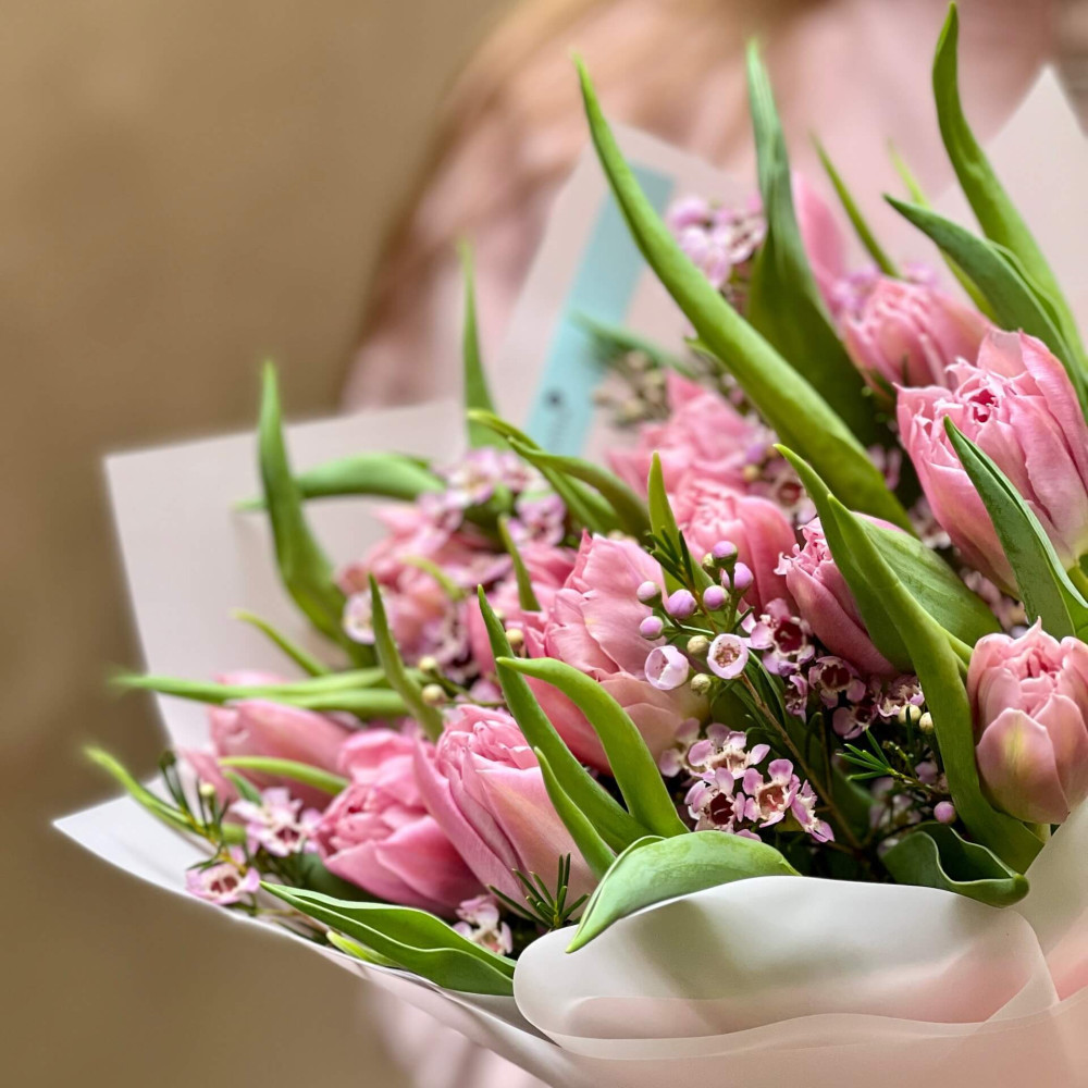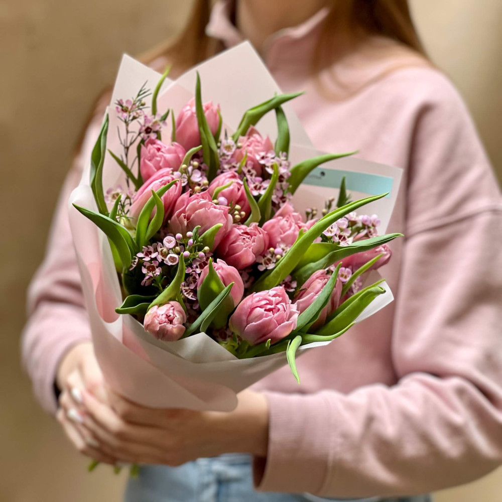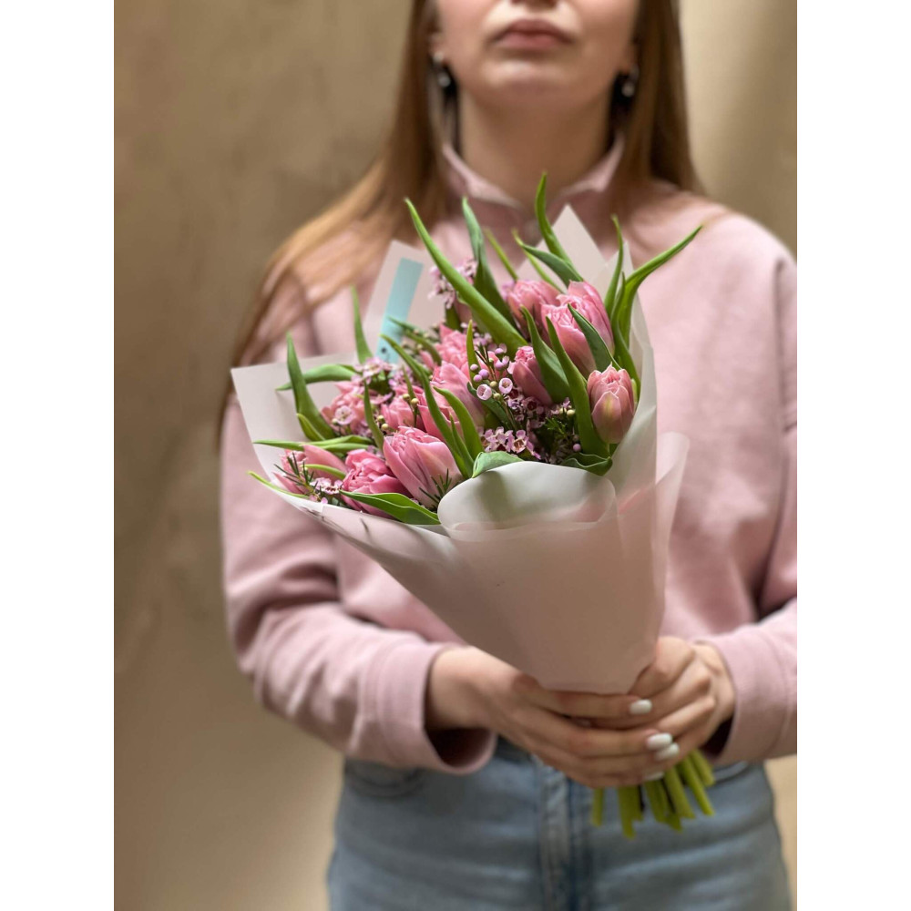 - Як замовити Букет з тюльпанів та хамелаціуму «Рожева нотка»? ❯