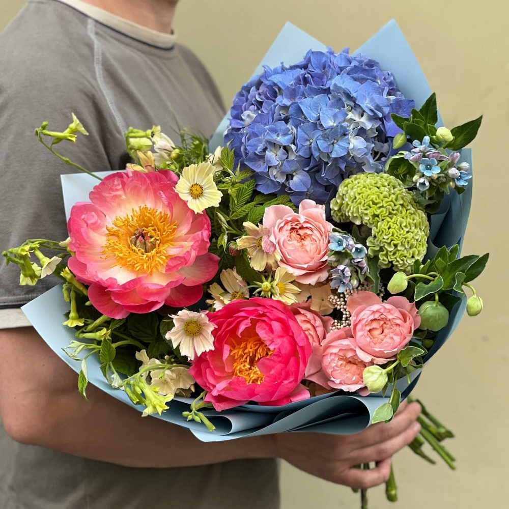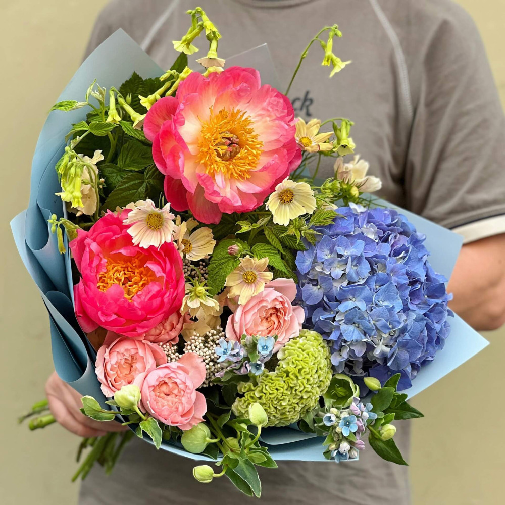 Квіти: Гортензія, Півонія, Троянда піоновидна, Целозія, Хелеборус, Космея, Малина