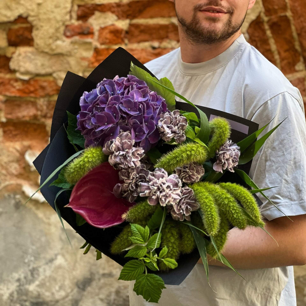 Пухнаста сетарія приємно контрастує з глянцевим антуріумом, а оксамитові діантуси і гортензія приносять спокій та баланс в цей пристрасний дует. Неначе розмова між двома закоханими серцями, цікава та яскрава, яка плете ниточки симпатії та любові.