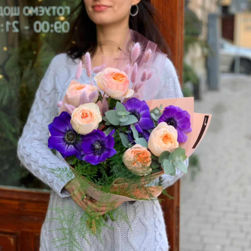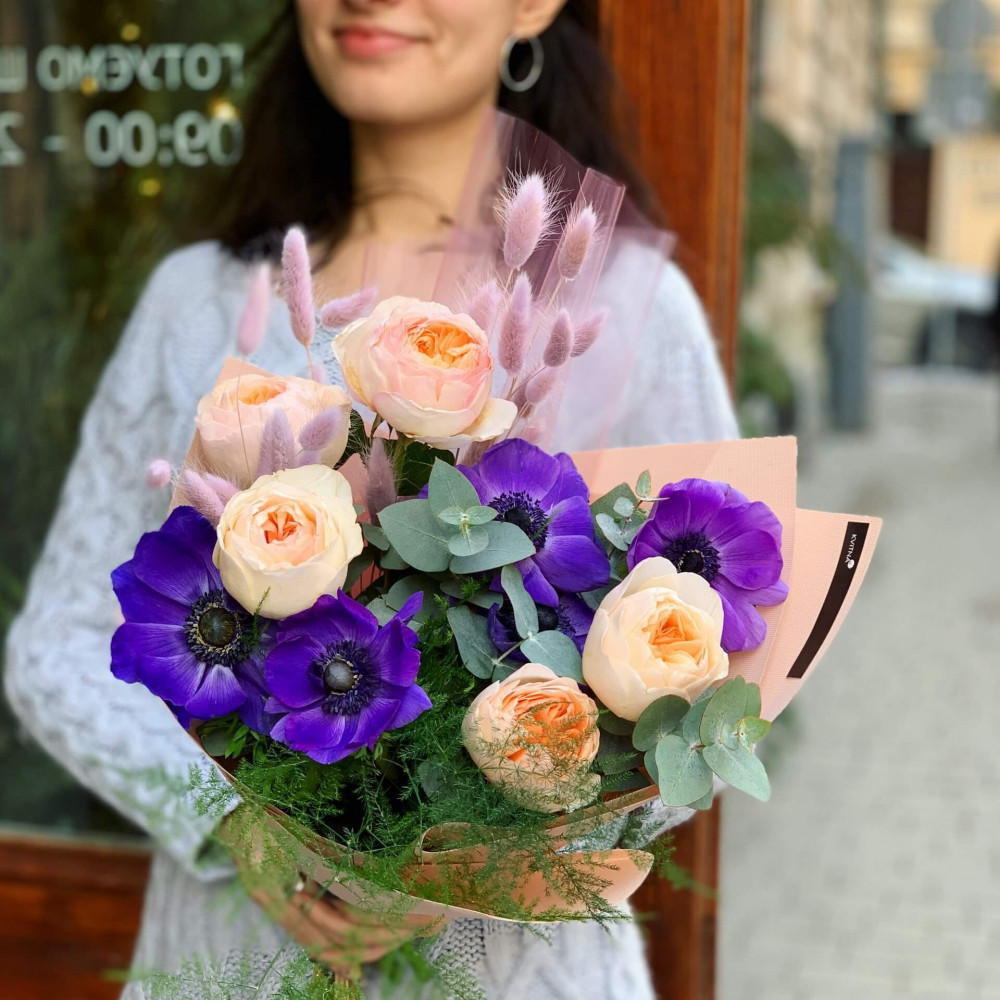 Квіти: Троянда піоновидна, Лагурус, Анемон, Евкаліпт, Аспарагус