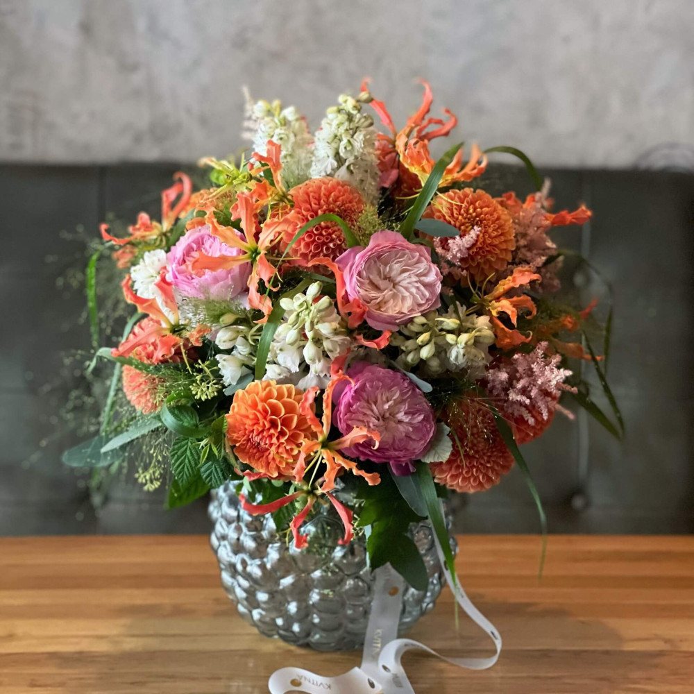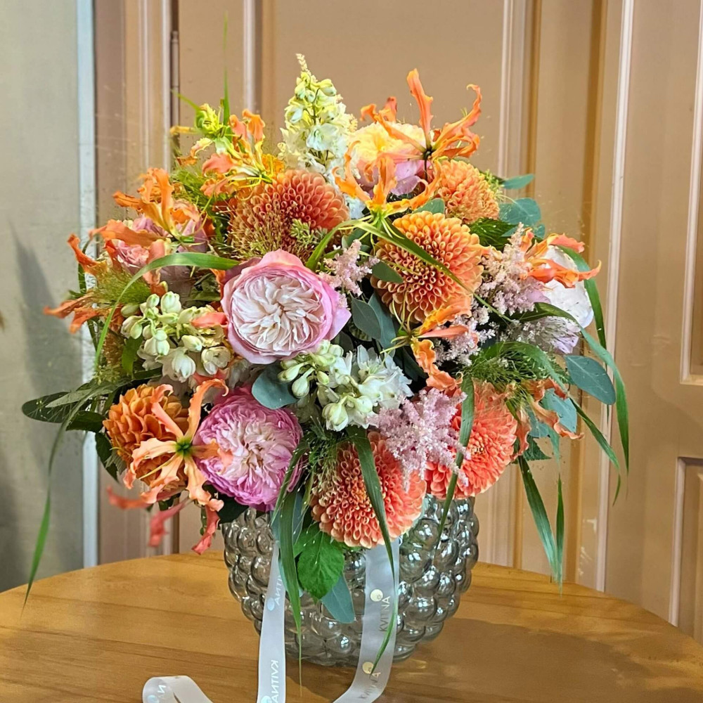 Квіти: Троянда піоновидна, Дельфініум, Глоріоза, Жоржина, Панікум, Астільба, Евкаліпт