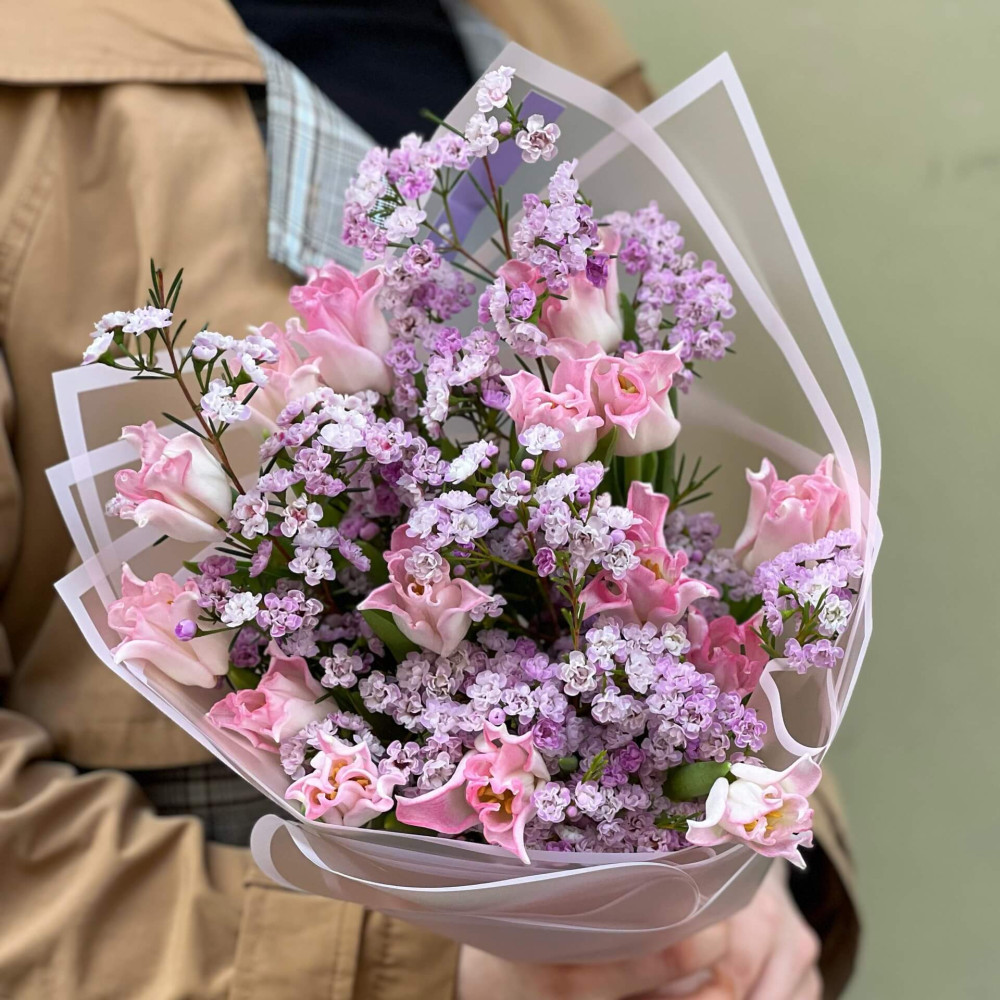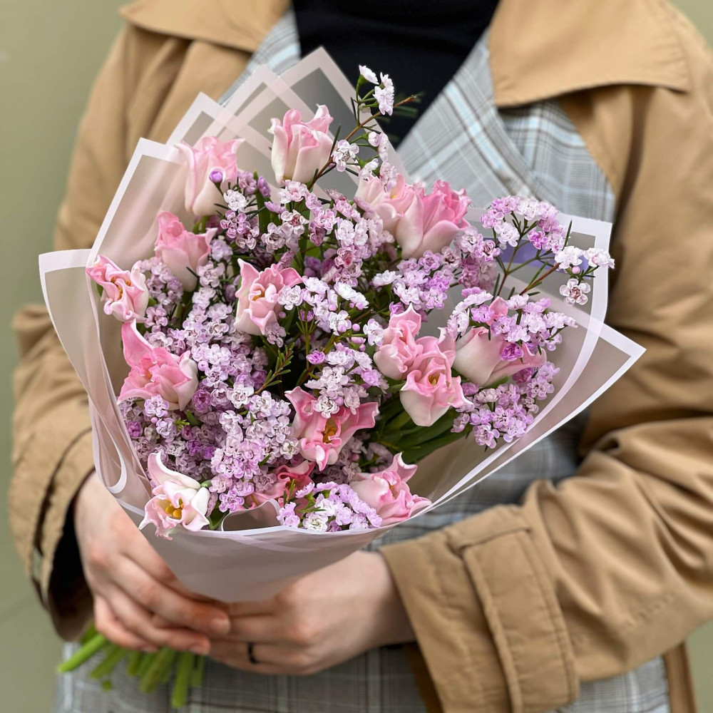 Мереживно-рожевий букет з весняних тюльпанів та ніжного воскоцвіту з ароматним листями. Елегантно, лаконічно і... романтично.