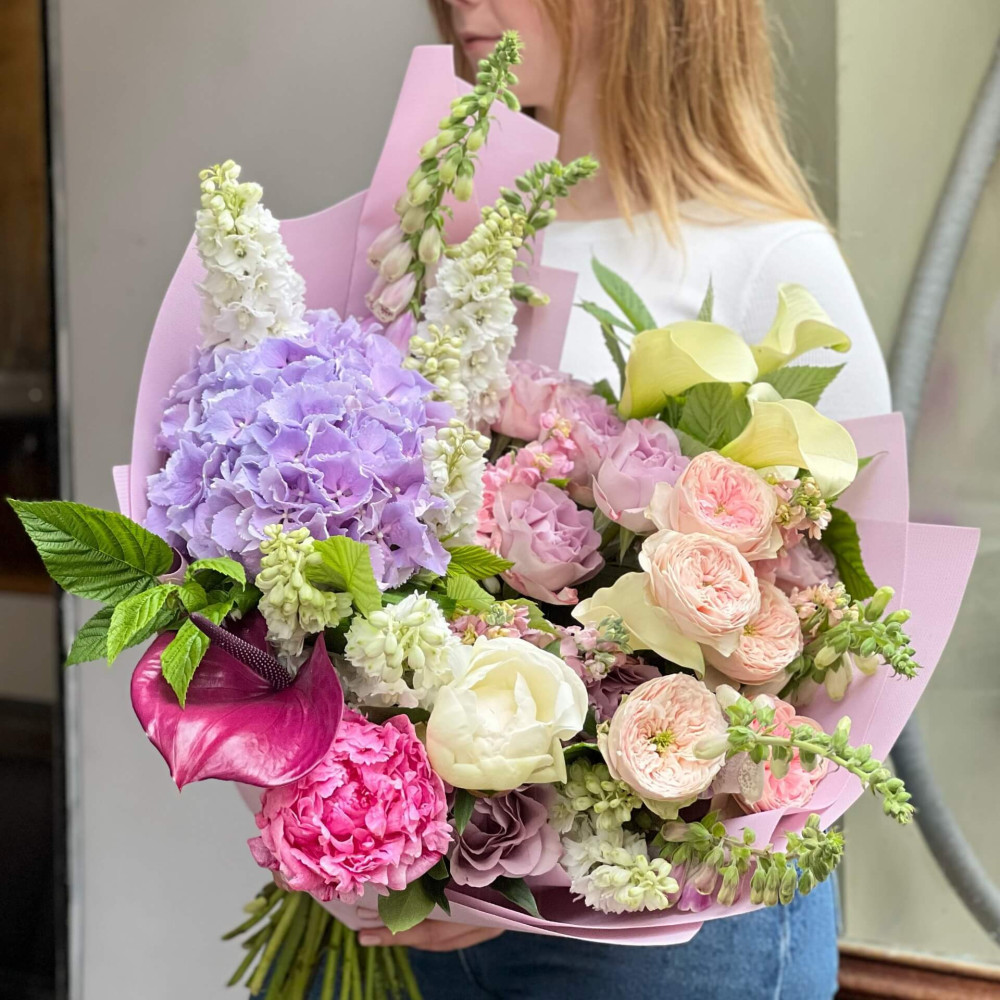 Квіти: Гортензія, Півонія, Антуріум, Зантедескія, Троянда піоновидна, Троянда, Дельфініум, Наперстянка, Малина