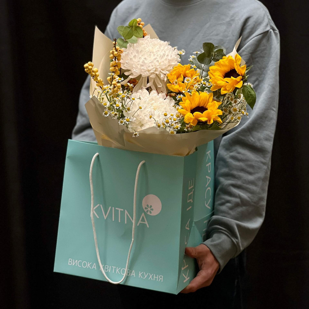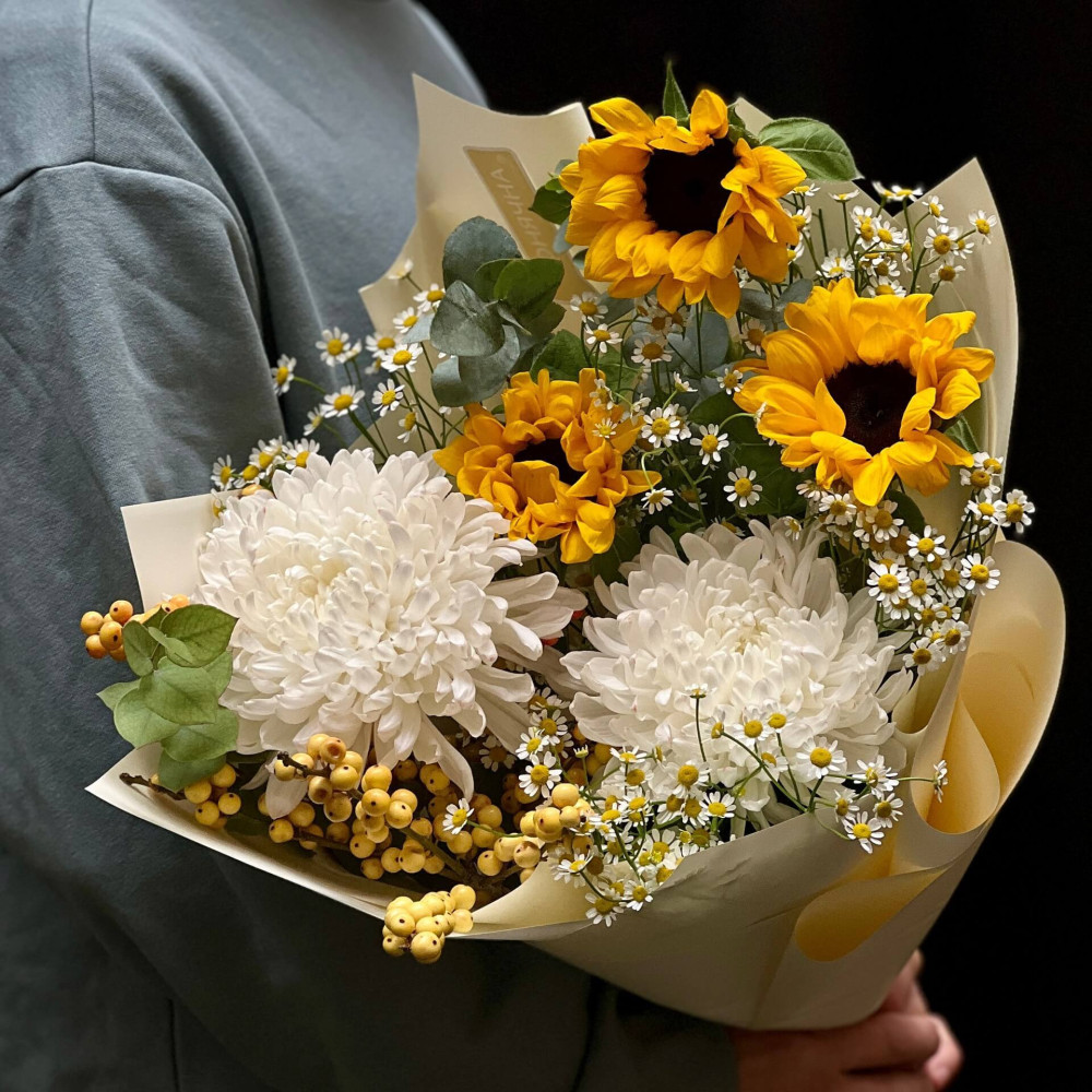 Букет – як промінчик сонця на білій стіні, квіти мерехтять, як сонячні зайчик, які спалахують золотими іскорками на соняхах. Трошки казкового світла для твого серденька.