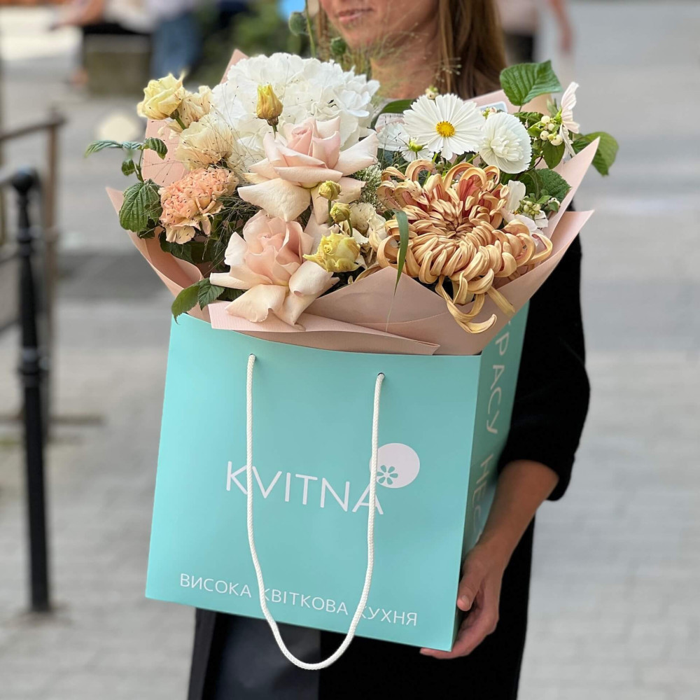 І це, до речі, зовсім не обов'язково плюси, це особливості, які потрібно розуміти. Тоді і вибір «де купити букет у Львові» зробити буде значно простіше.- Кожен букет Kvitna унікальний. Це означає, якщо Ви замовите у нас якийсь із букетів на сайті, то Ви не отримаєте точнісінько такий же. Деяких це бентежить, такі люди не хочуть «ризикувати», бажають «в точності, як на світлині». У «Квітна» кожен букет — це творчий пошук, це захоплення, злиття з квітами, образом одержувача і завданням. Так, ми можемо прийняти за вектор, зробити схожий букет, в тому ж стилі, кольоровій гамі, з тих самих квітів ... Але нам нудно робити за шаблоном. Адже букет, представлений на зображенні, робився для іншої людини, з іншого приводу, під інший настрій і натхнення. У Вас буде все по-іншому.