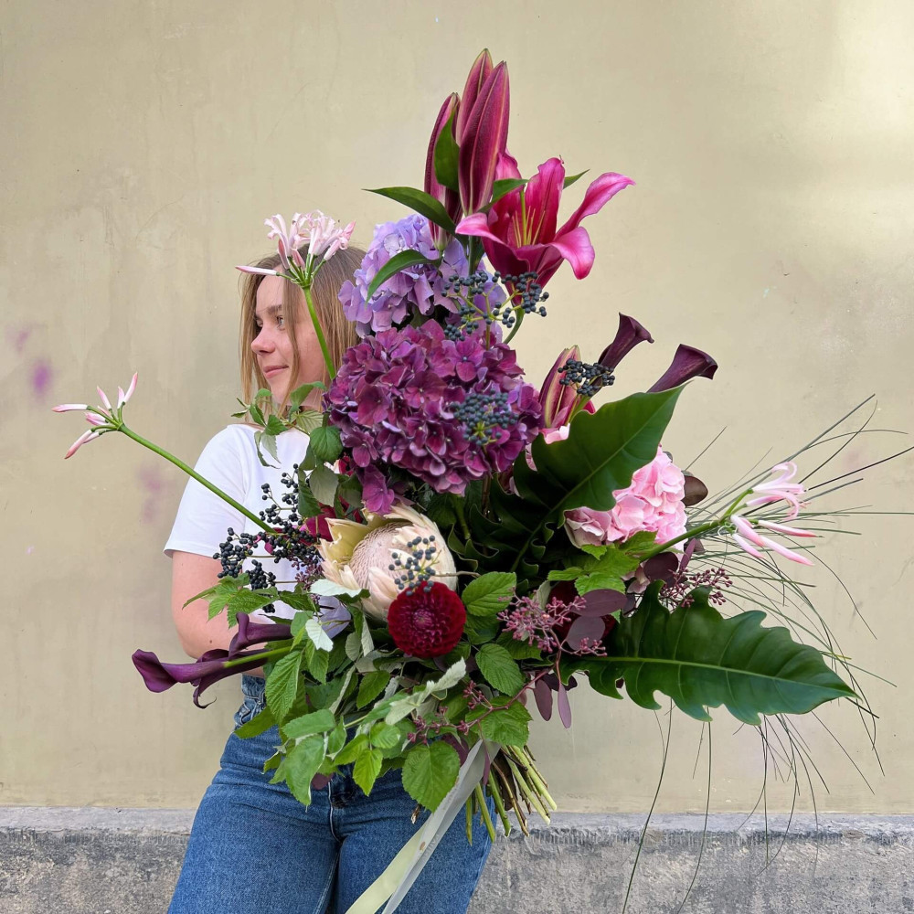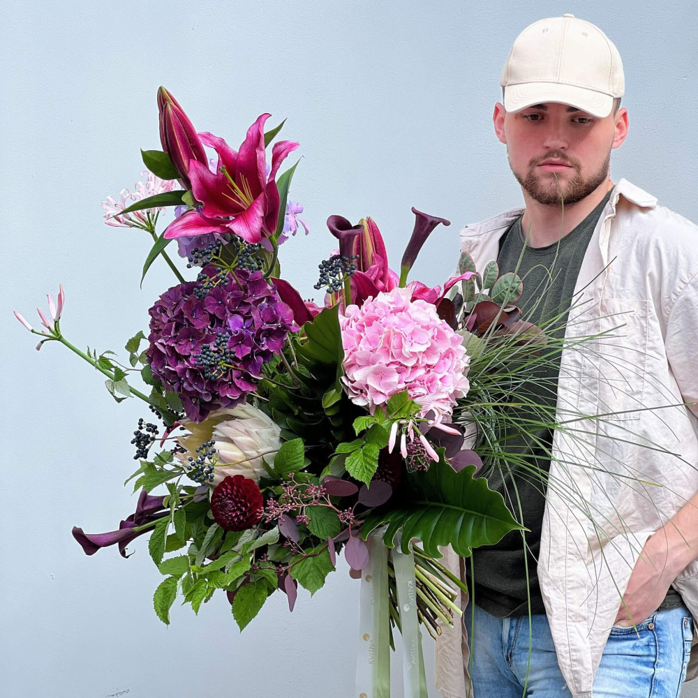 Квіти: Гортензія, Протея, Лілія, Неріне, Евкаліпт, Малина (листя), Зантедескія (Кала), Жоржина, Берграс, Вібурнум (ягоди)