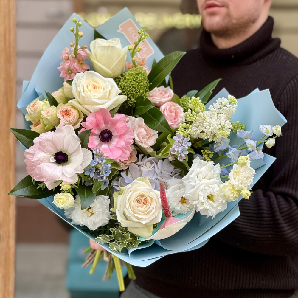 Блакитно-рожевий букет для улюблених мрійниць – ніжні рум'яні анемони, ароматна матіола та фарфорова кущова троянда гармонійно поєднані з блакитною кулькою гортензії, блакитним дельфініумом, білими трояндами та бузком. Букет кольору солодких мрій.
