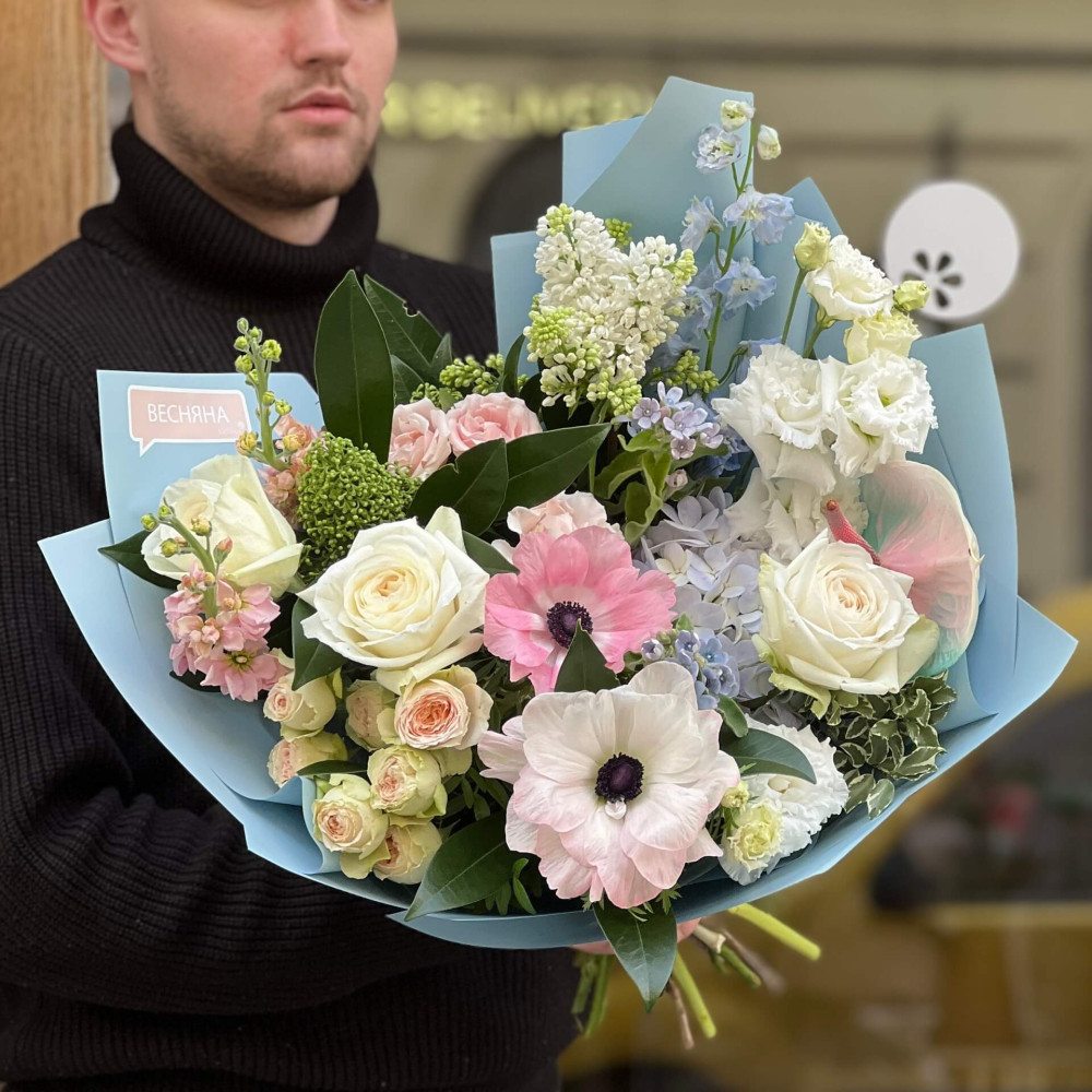 Квіти: Троянда піоновидна кущова, Гортензія, Анемон, Троянда піоновидна, Бузок, Дельфініум, Оксіпеталум, Скімія, Матіола, Еустома