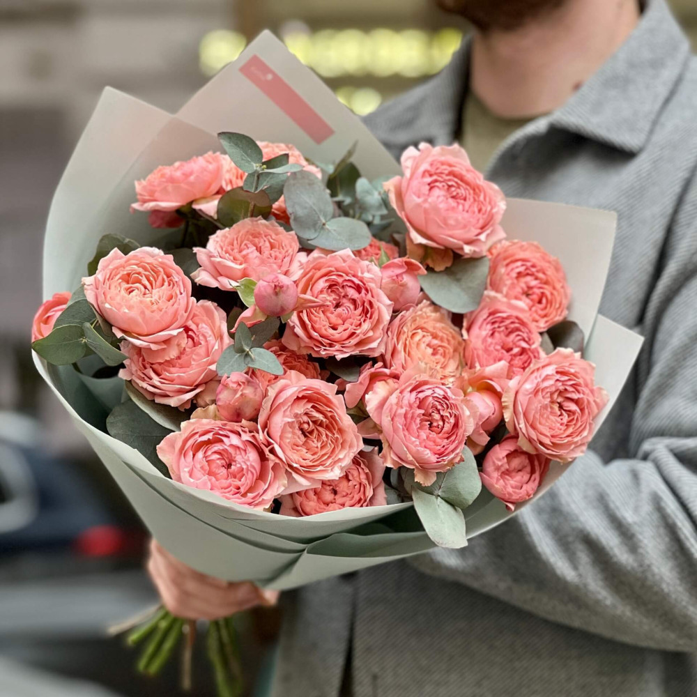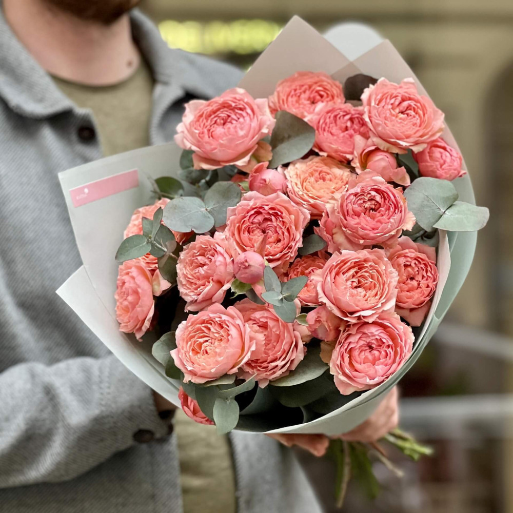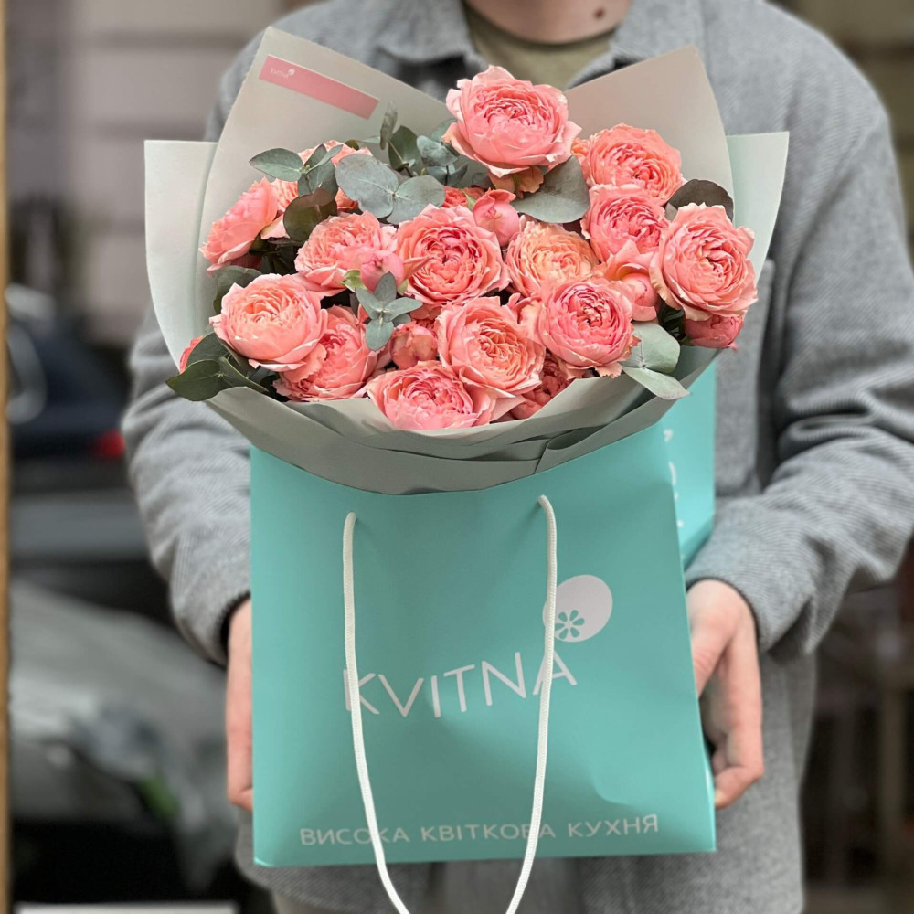 - Як замовити Чудовий букет із 7 гілок кущової піоновидної троянди Джульєтта та евкаліпту «Персикова насолода»? ❯