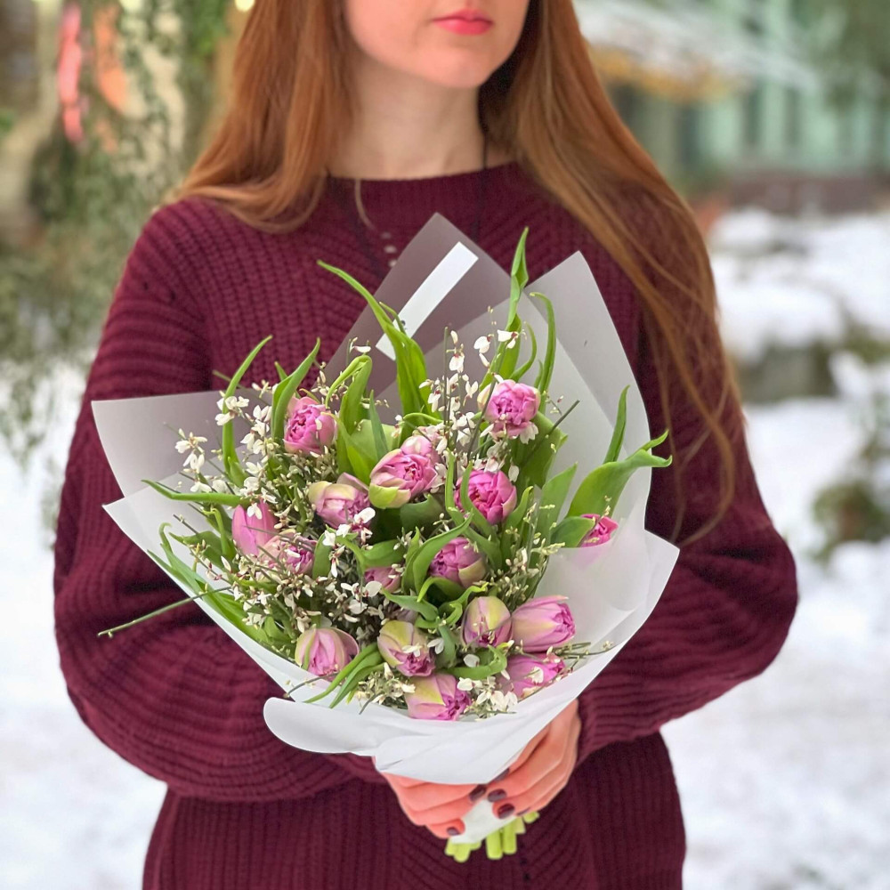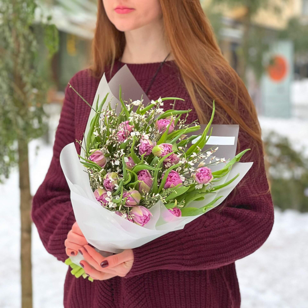 - Як замовити Дуо букет із піоновидних лавандових тюльпанів та запашної білої геністи «Весняночка для Анюти»? ❯