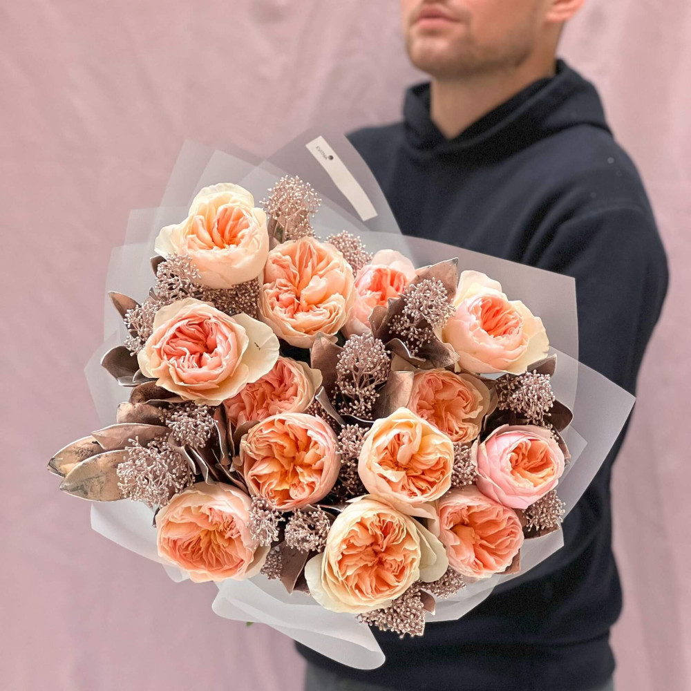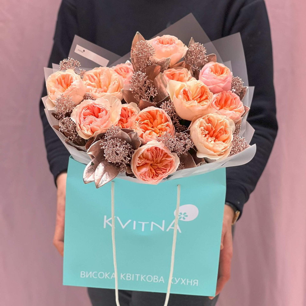 - Як замовити Дуобукет із піоновидних троянд Juliet та скімії «Персики для Анни»? ❯