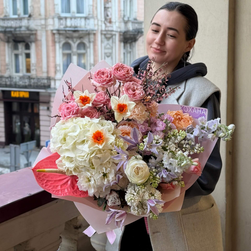 - Як замовити Дивовижний букет з додаванням нарцисів та бузку «Ранковий кекс»? ❯