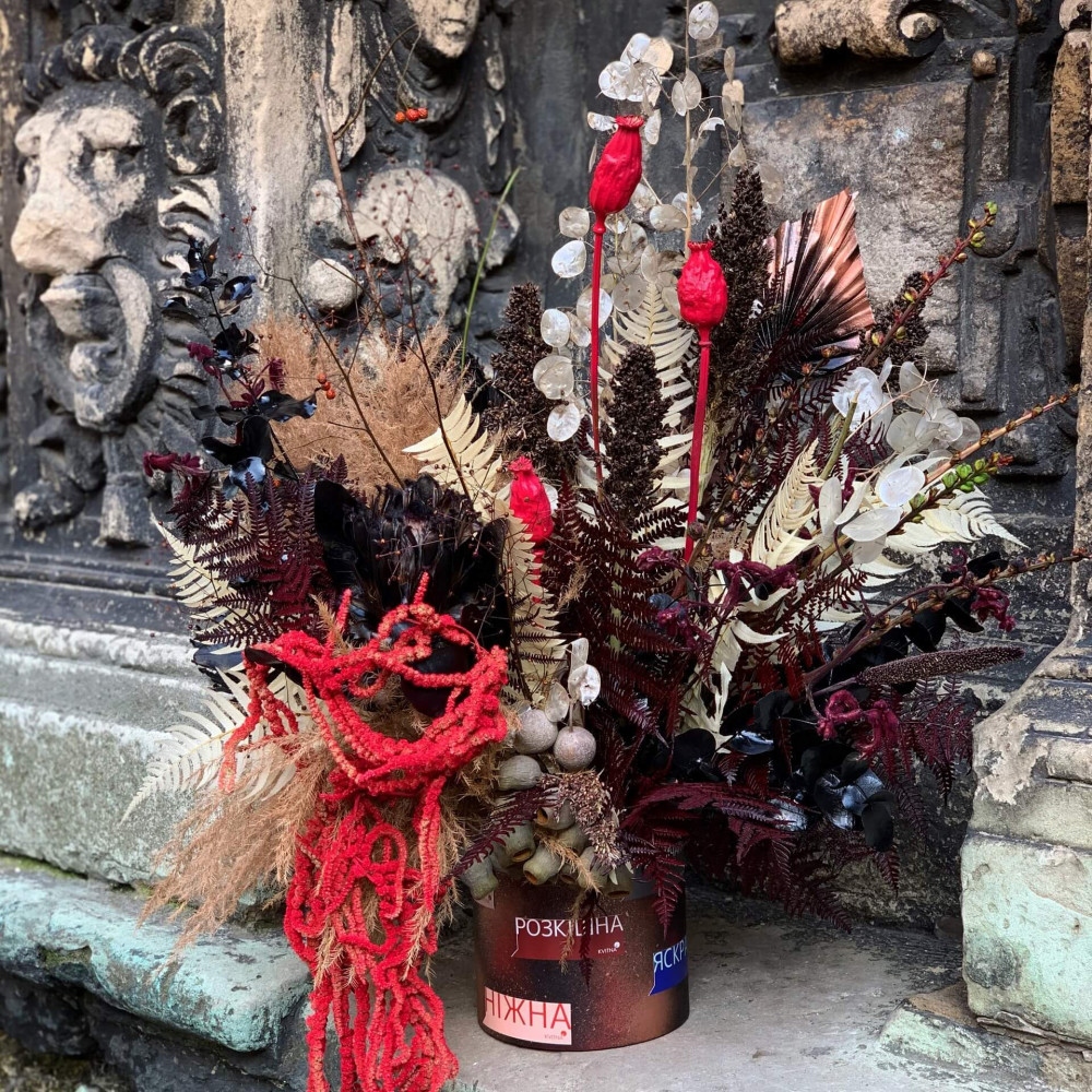 Нехай композиція (коробка, кошик, сніп) з квітами від Квітна тішить Вас якнайдовше!