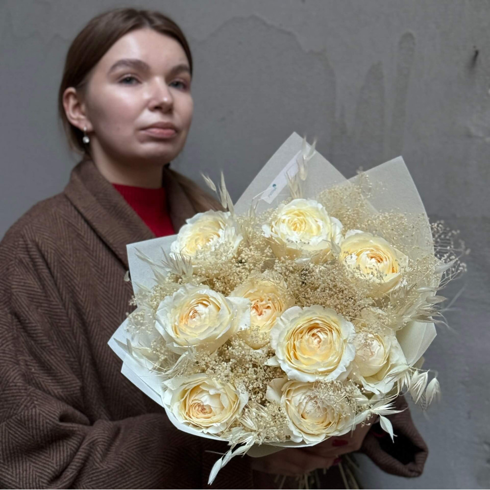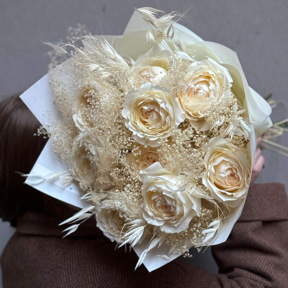 Квіти: Троянда піоновидна сорту Innocent від плантації Parfum Flower Company - 9 шт., Гіпсофіла стабілізована, Овес