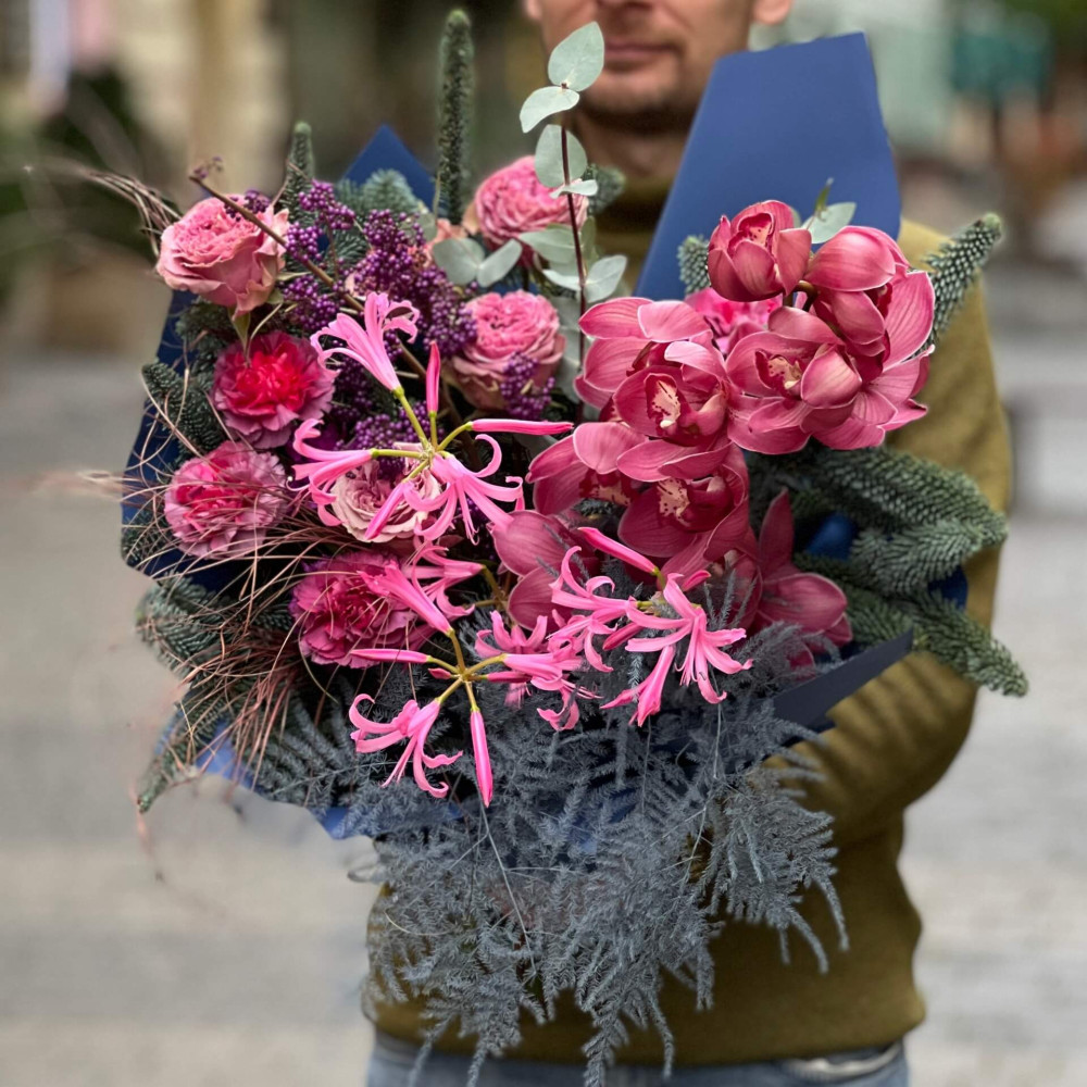 - Як замовити Екстравагантний букет з цимбідіумом «Пурпурова імла»? ❯