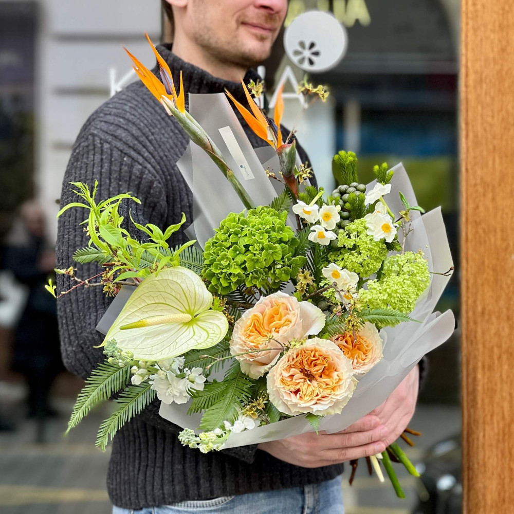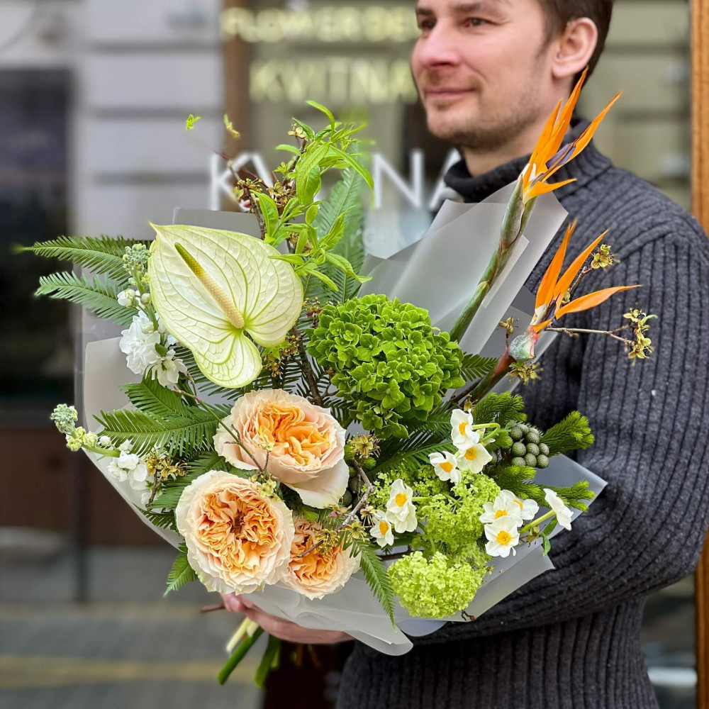 Квіти: Стреліція, Амбрела, Вібурнум, Троянда піоновидна, Нарцис, Матіола, Антуріум, Гортензія, Брунія, Кизил, Салікс