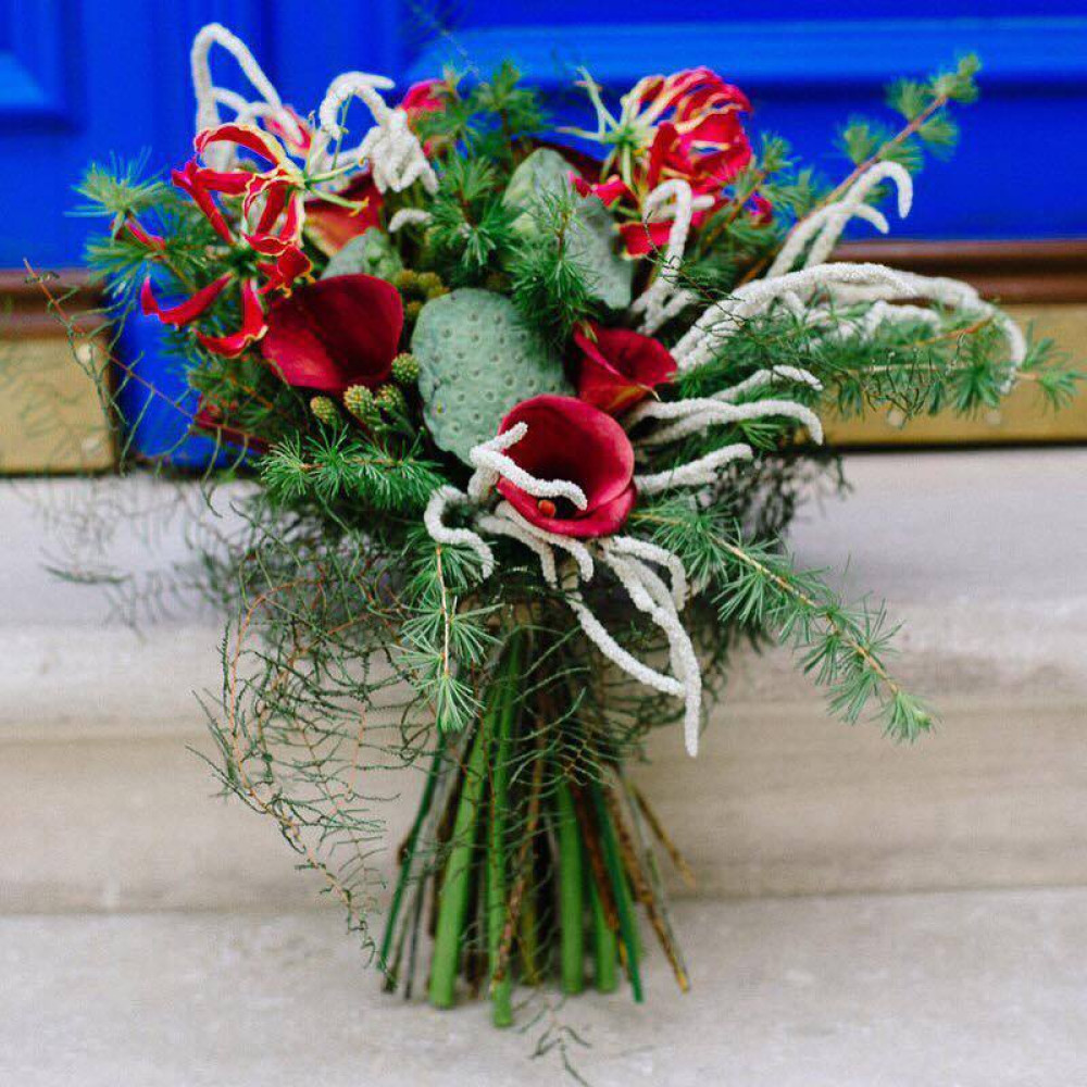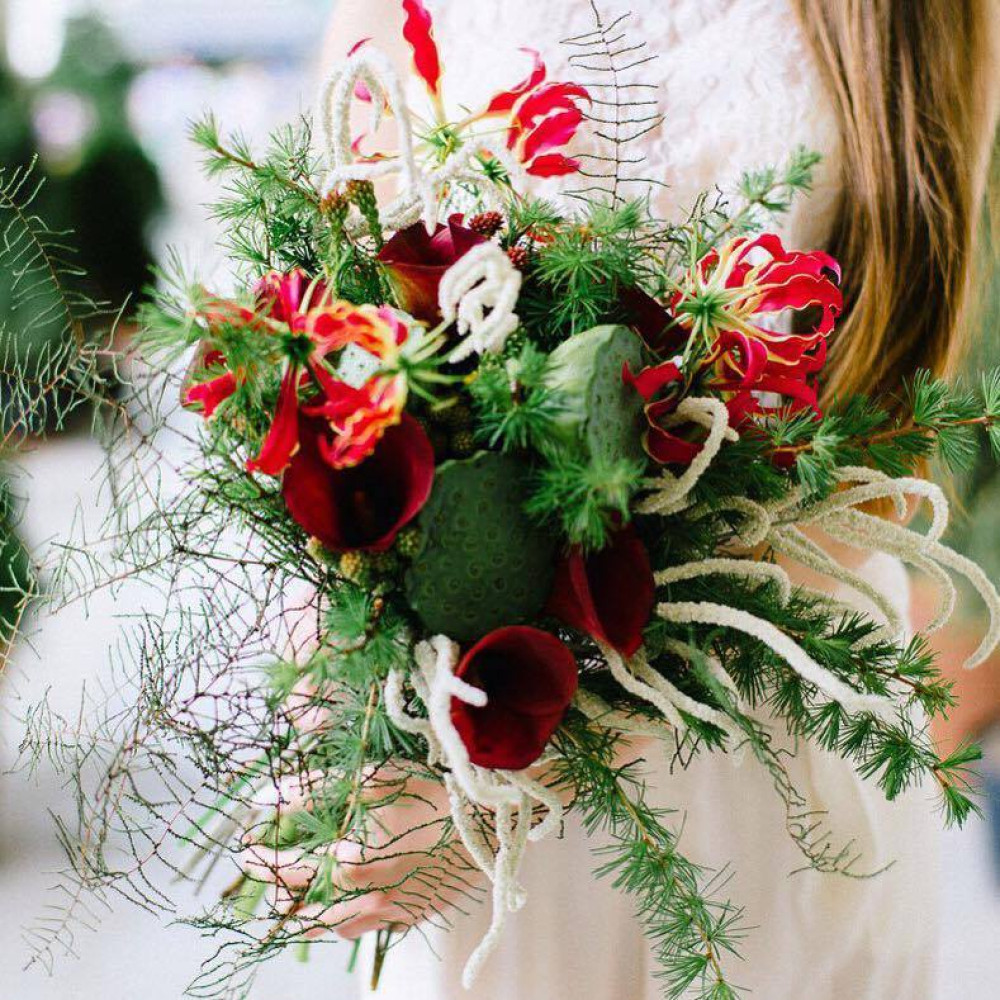 Цікавий та незвичний букет з екзотичними квітами зантедезіі, коробочками нелюмбо та тендітною глоріозою стане прекрасним подарунком для стильних та впевнених в собі осіб