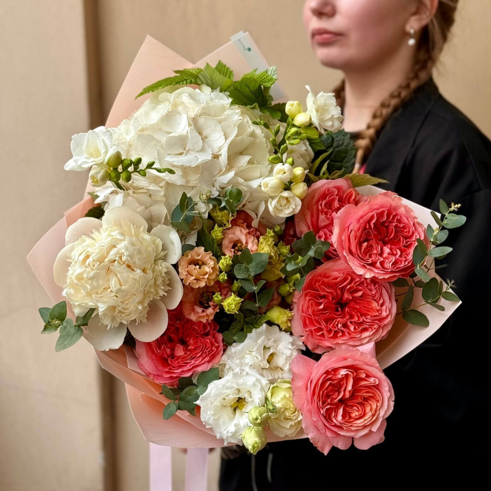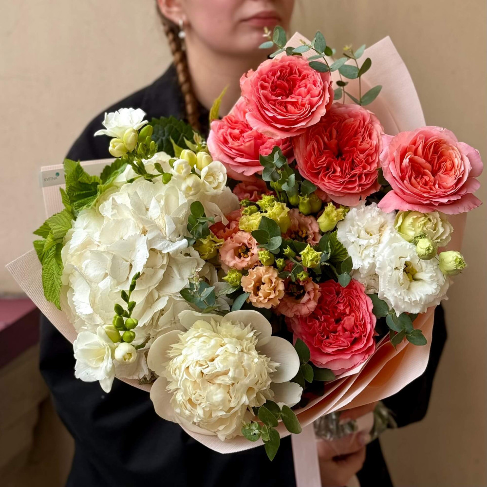 Квіти: Еустома, Малина (листя), Півонія, Евкаліпт, Фрезія, Гортензія, Троянда піоновидна