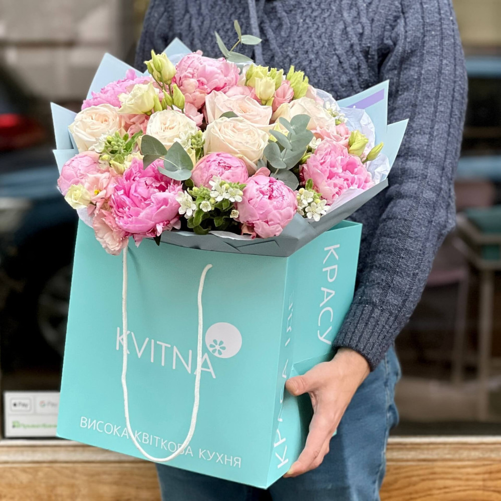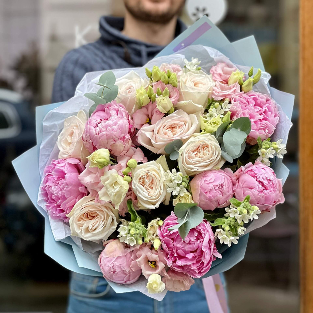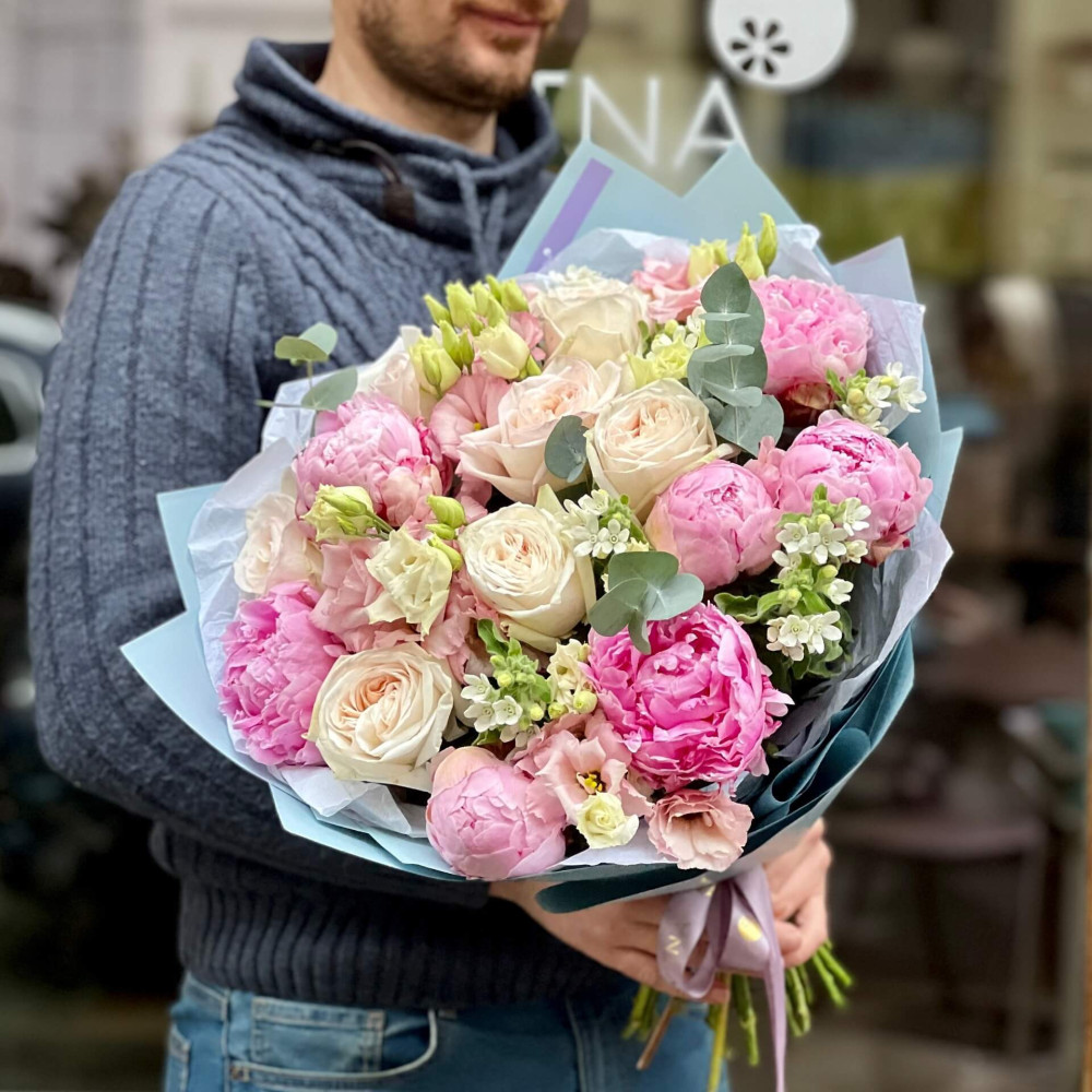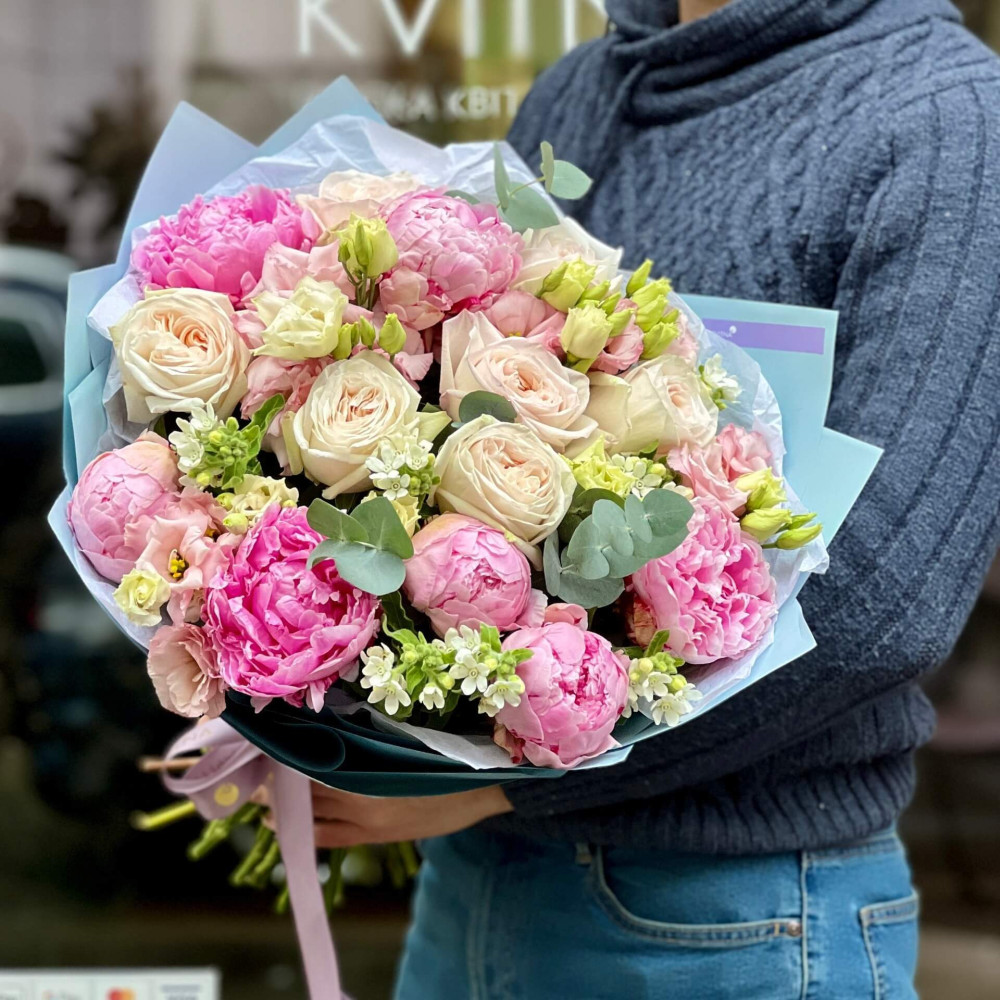 Квіти: Півонія, Еустома, Троянда піоновидна, Евкаліпт, Оксіпеталум