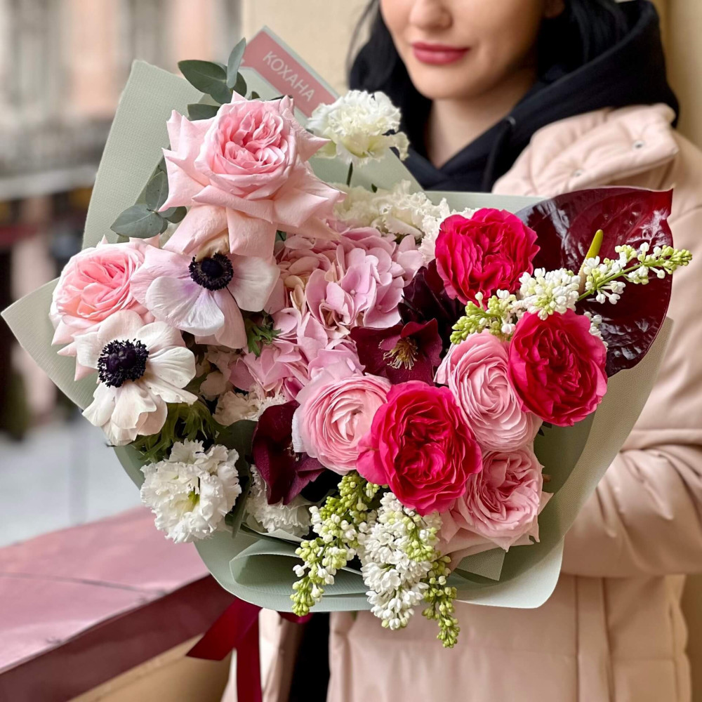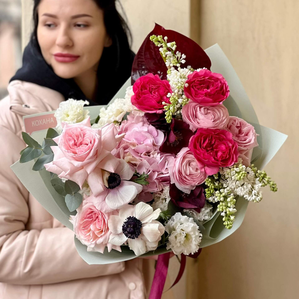 Квіти: Анемон, Троянда піоновидна, Бузок, Ранункулюс, Гортензія, Еустома, Евкаліпт