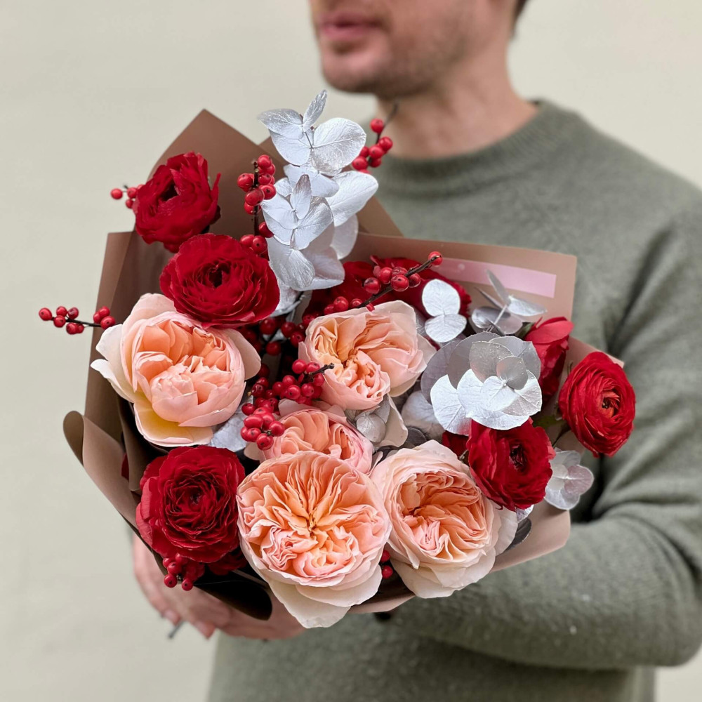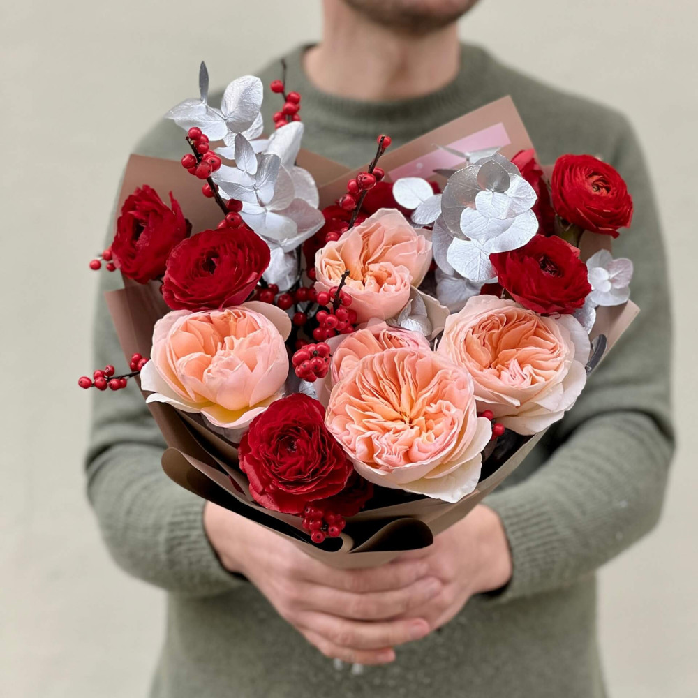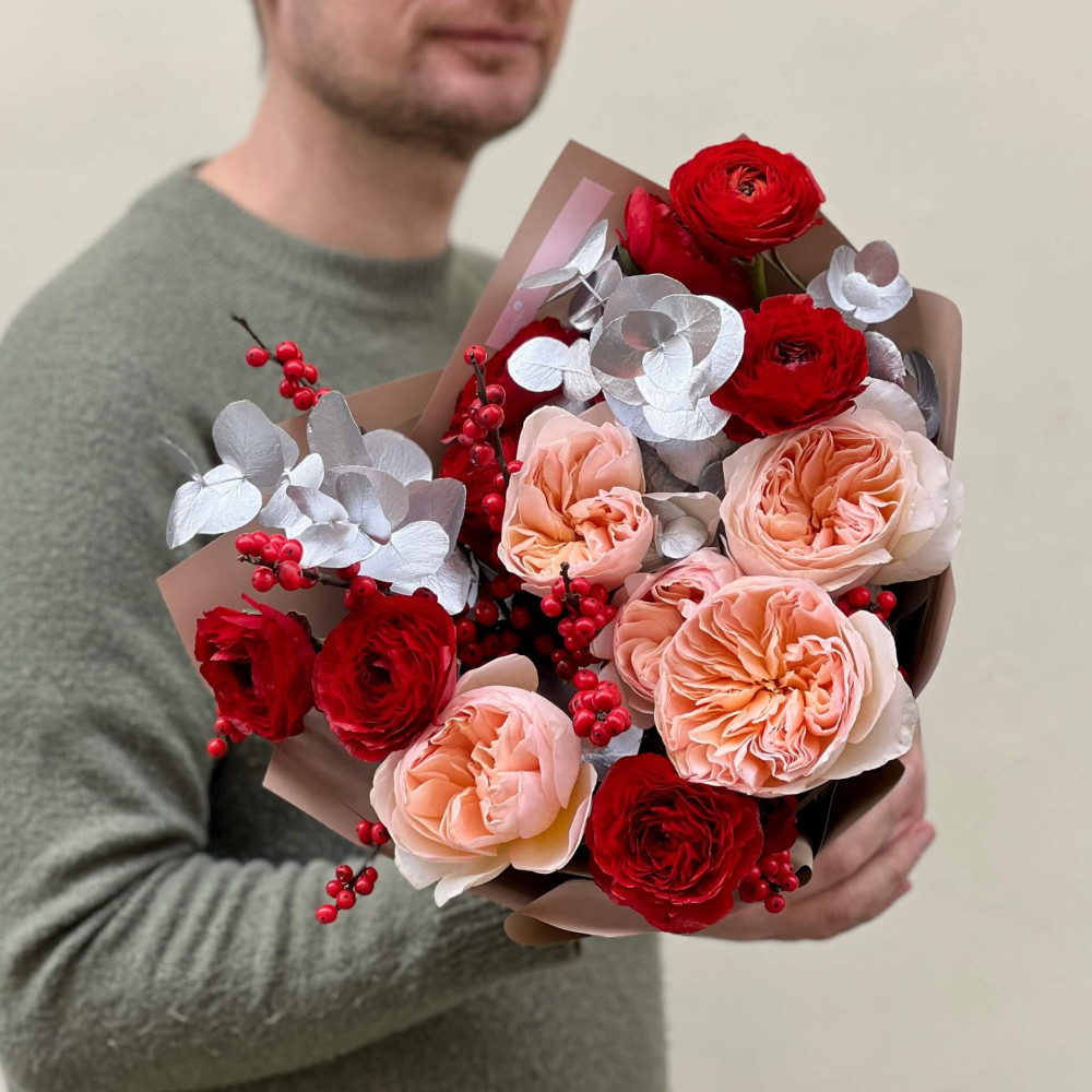 - Як замовити Елегантний букет з піоновидною трояндою Juliet та ранункулюсами Tango «Зимові коралі»? ❯