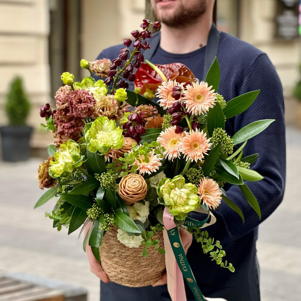 Нехай композиція (коробка, кошик, сніп) з квітами від Квітна тішить Вас якнайдовше!