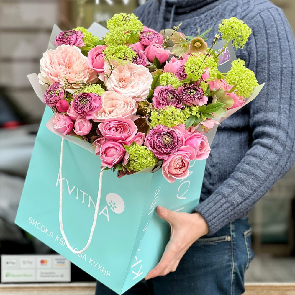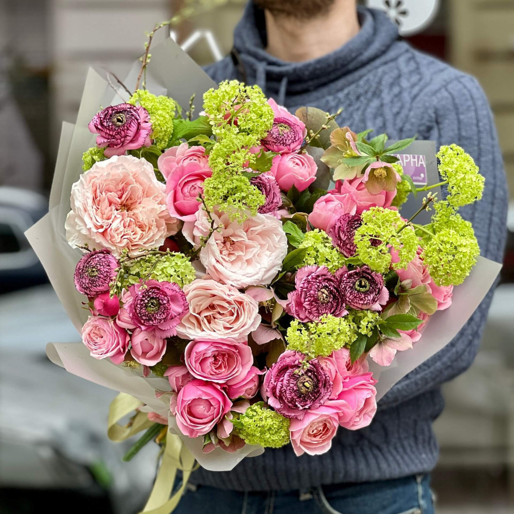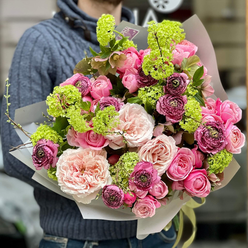 Вражаючий, пишний букет з світло-рожевими півонієподібними трояндами, яскравою рожевою трояндою Сільва Пінк, мов колір вишуканого шовку, пурпурові ранункулюси з орнаментом смужок, немов вишукане мереживо, та ніжний зелений вібурнум, ніби смарагдове намисто. Букет для володарки твого серця!