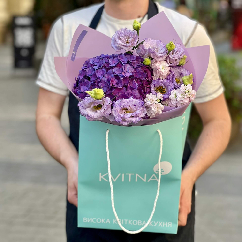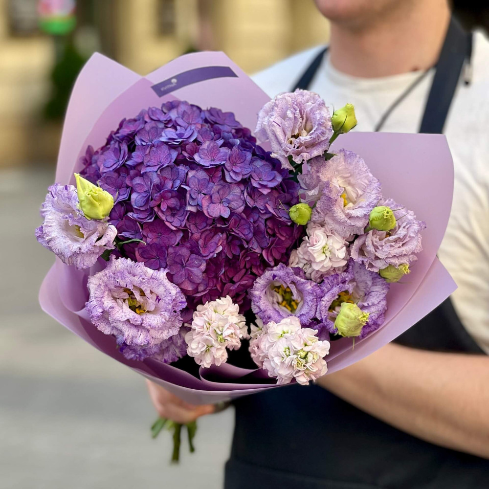 - Як замовити Фіолетовий букет з гортензією та еустомою «Загадкова квіточка»? ❯