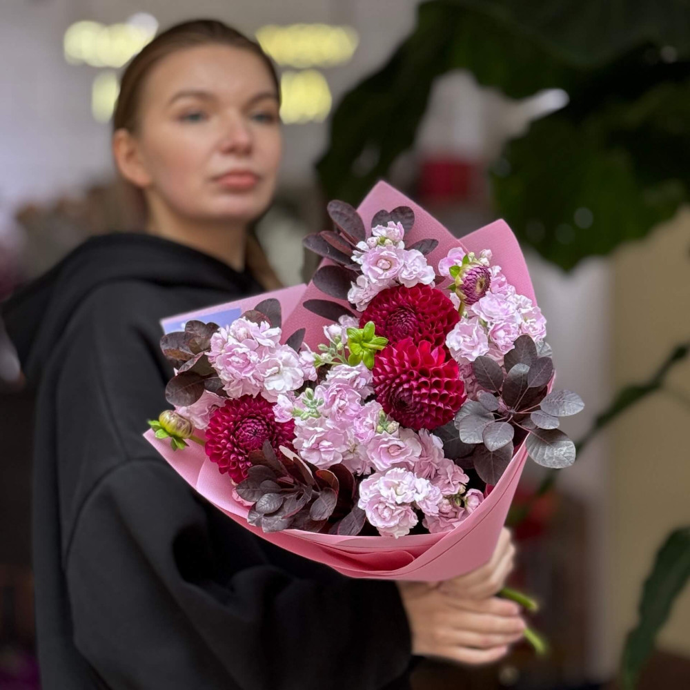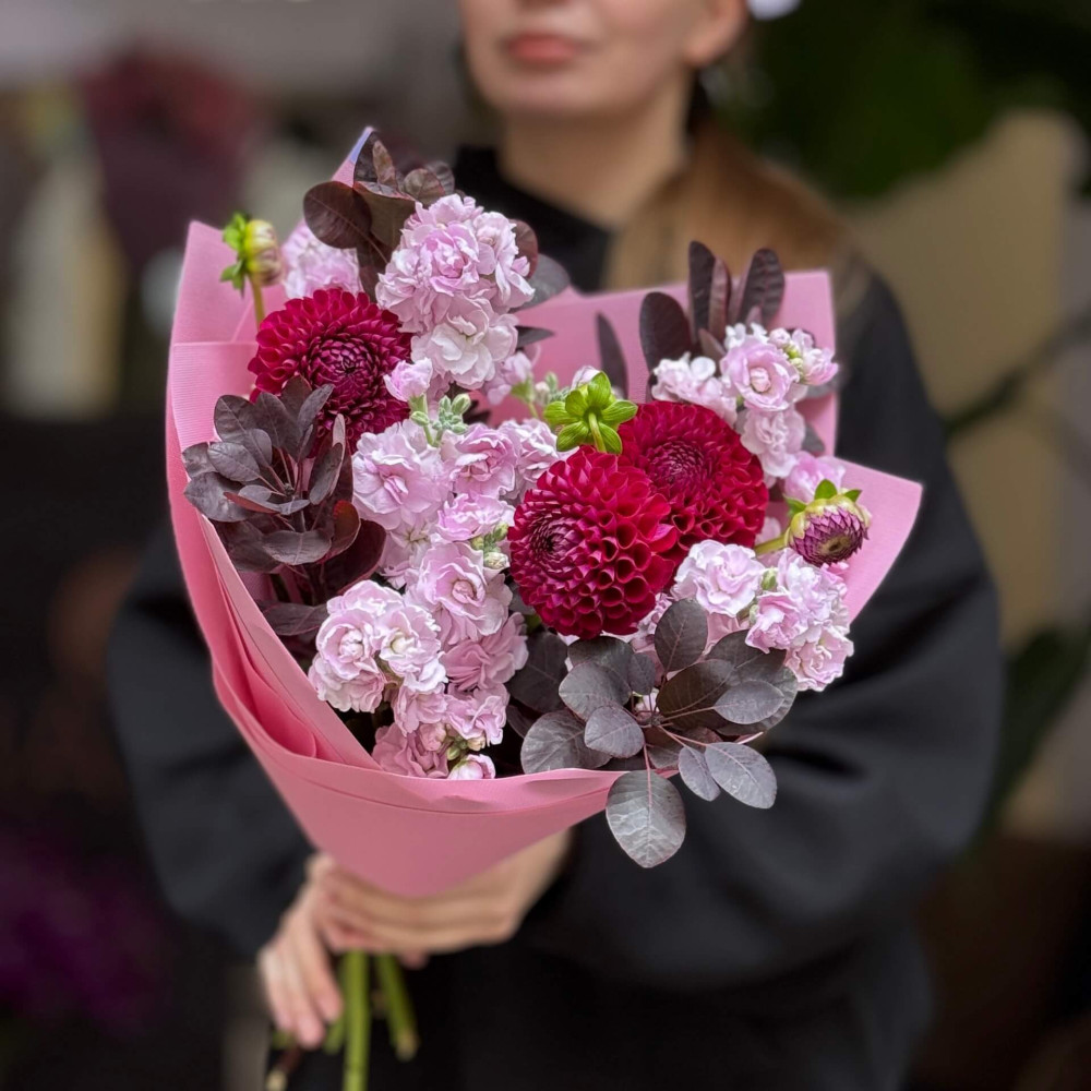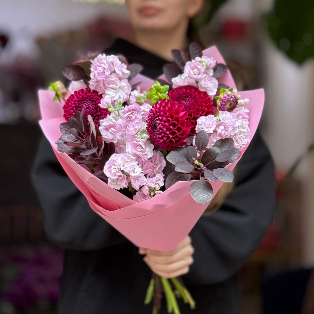 - Як замовити Ягідний букет з матіолою та жоржинами «Малиновий чізкейк»? ❯