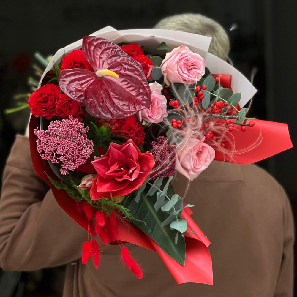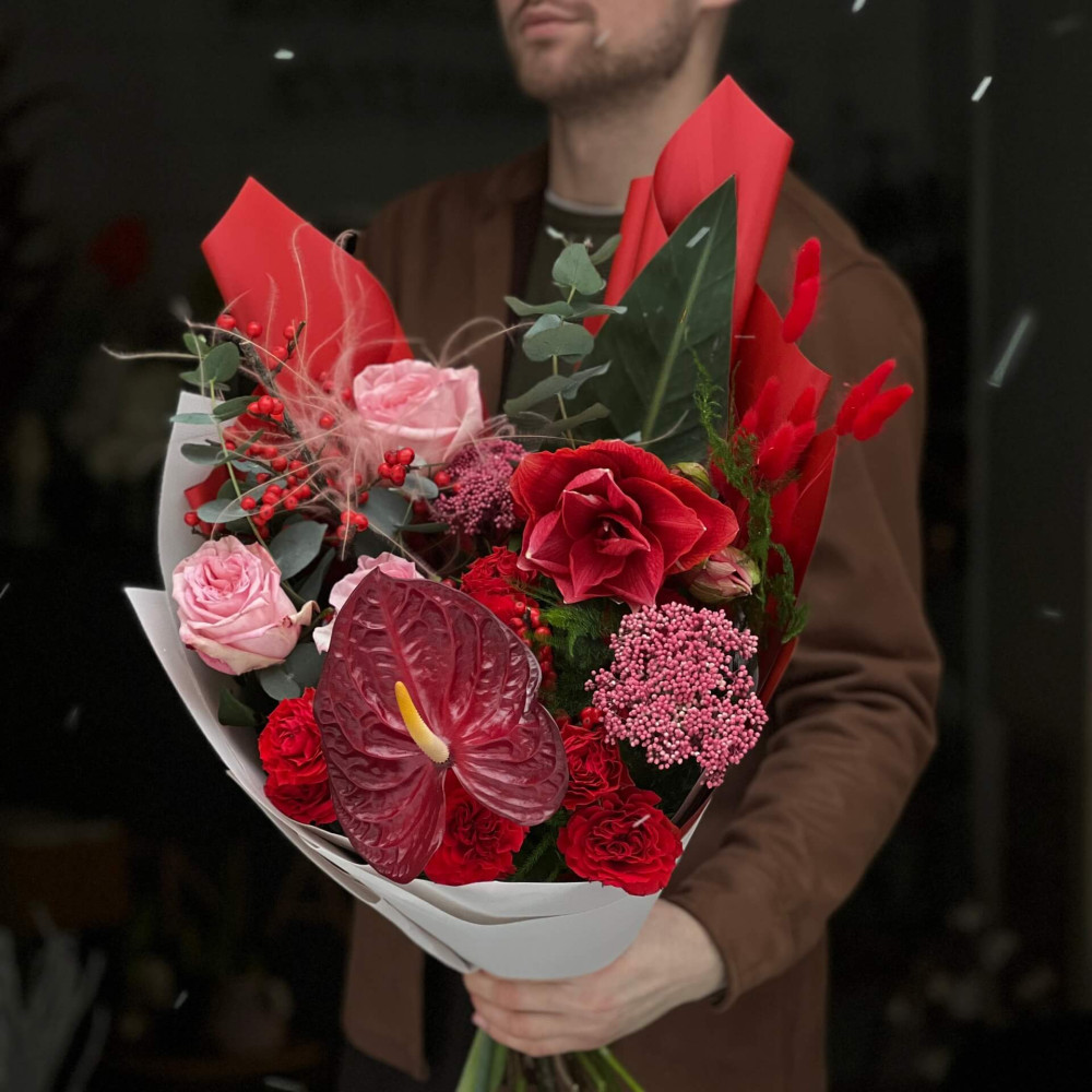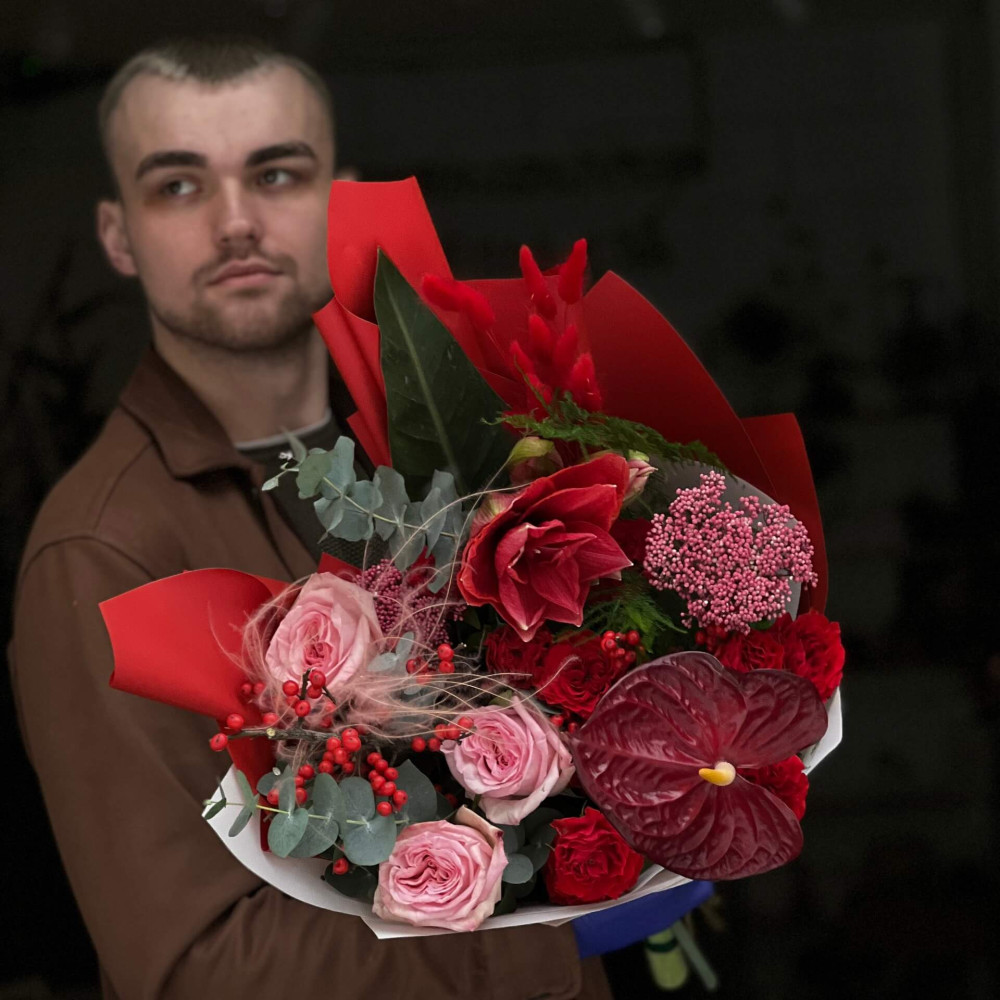 - Як замовити Яскравий букет з амарилісом та півонієвидними трояндами «Відтінки тепла»? ❯