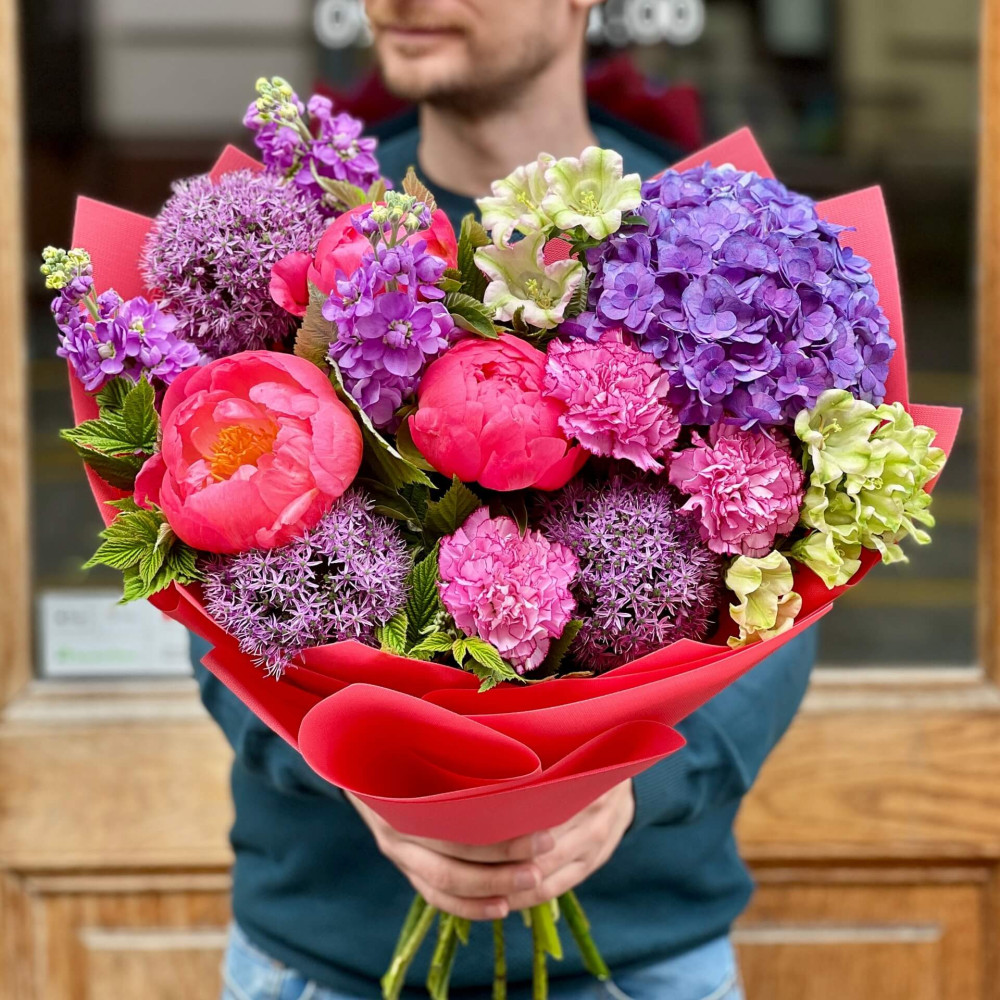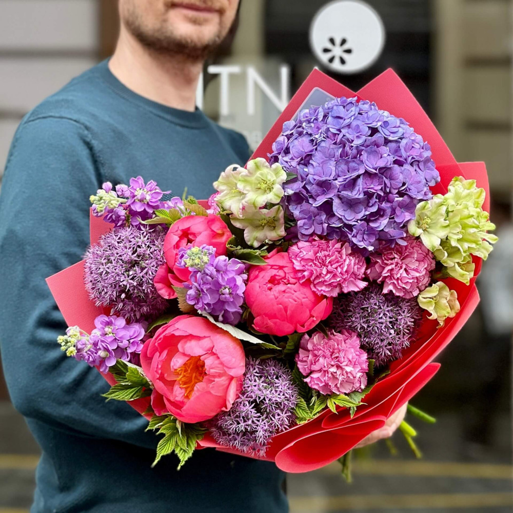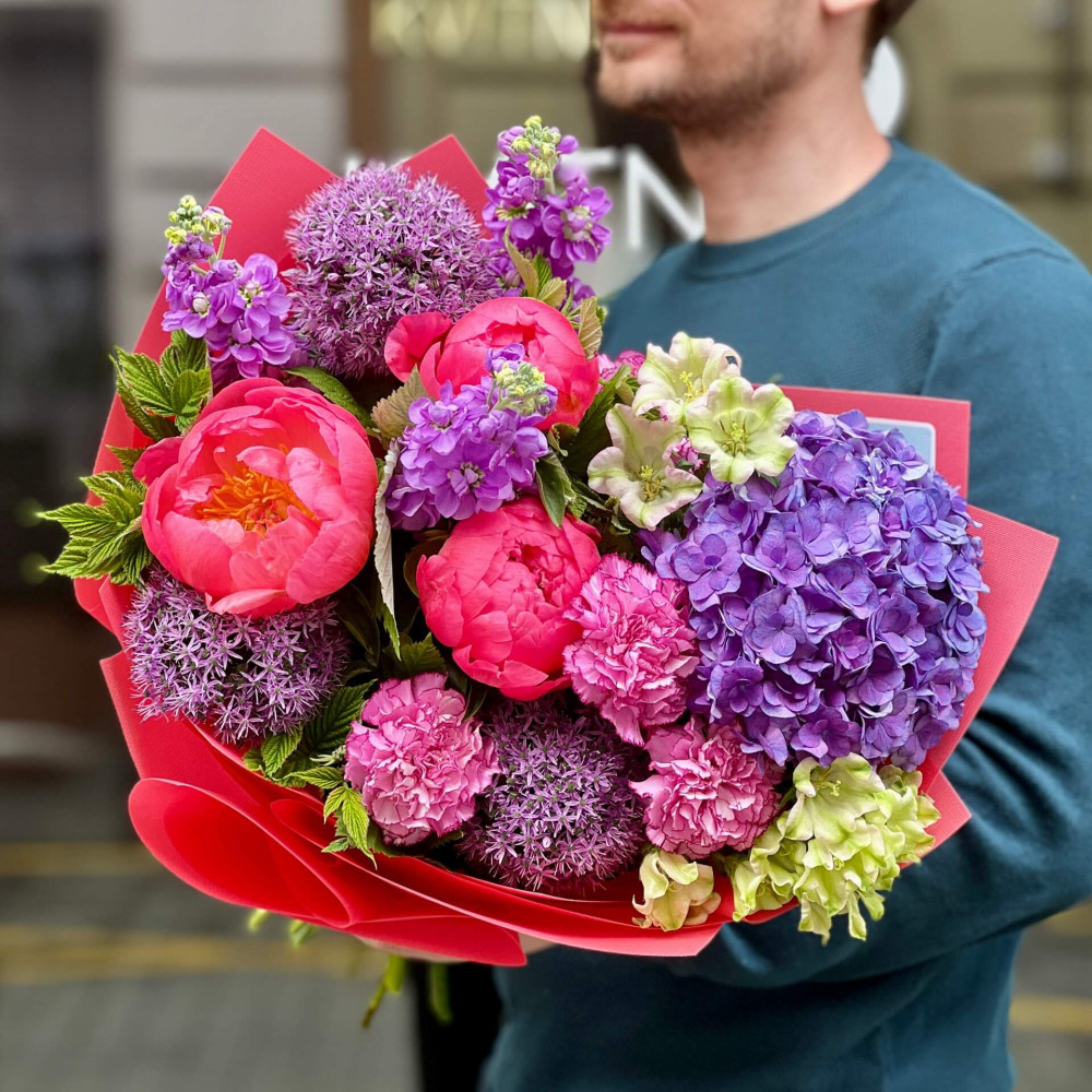 - Як замовити Яскравий букет з півоніями та гортензією «Незабутній вечір»? ❯