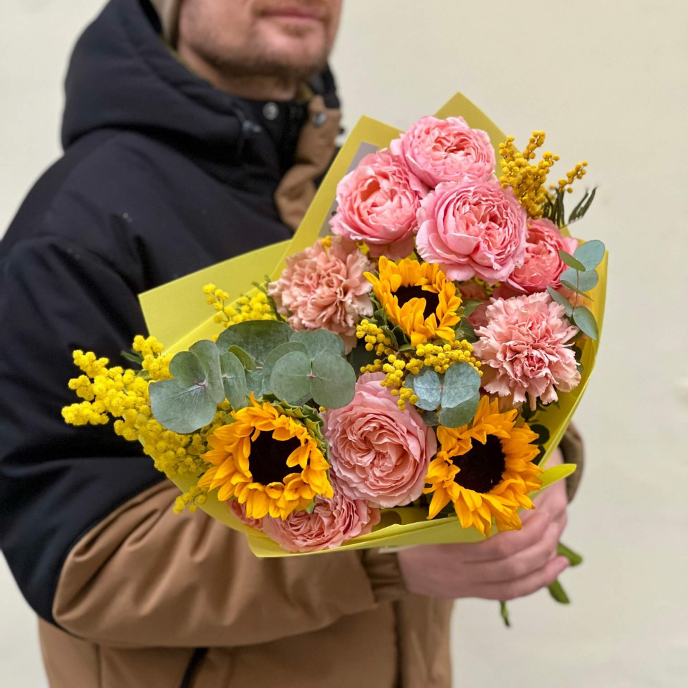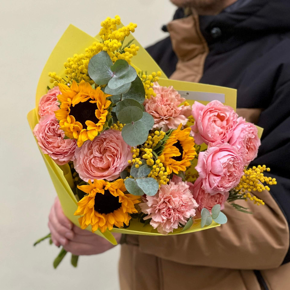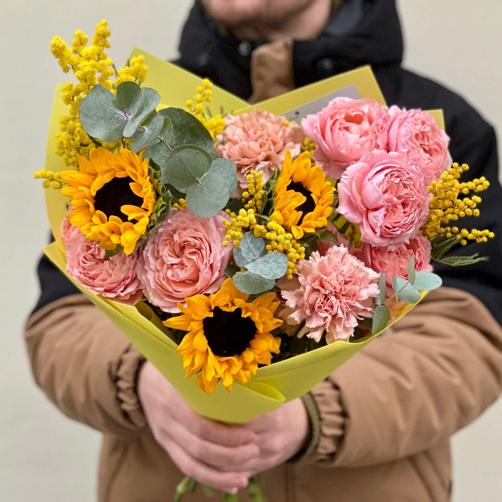 - Як замовити Яскравий букет з соняшниками та мімозою «Мандарин і манго»? ❯