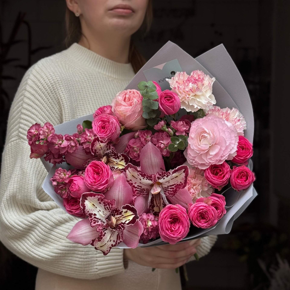 - Як замовити Яскравий букет з цимбідіумом та ранункулюсами «Зачарована весна»? ❯
