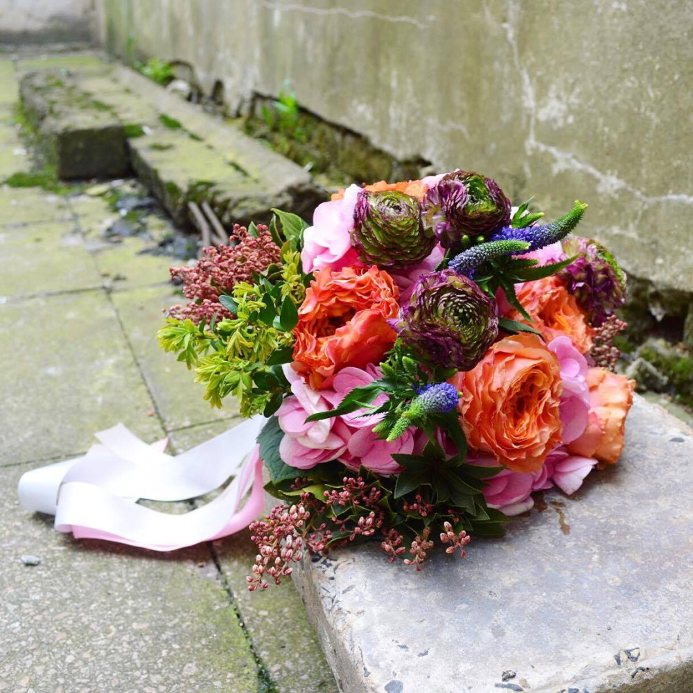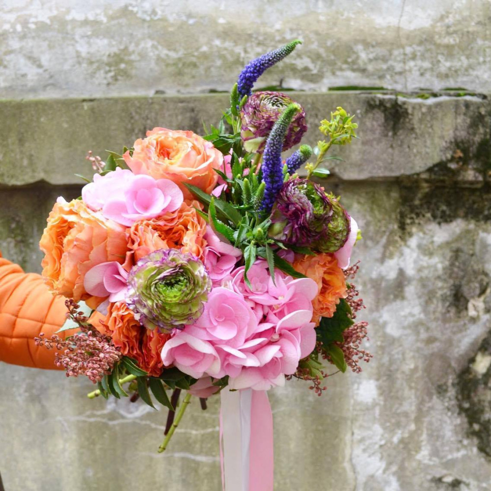 - Як замовити Кольоровий букет з трояндами каралуна, синьою веронікою та ніжно рожевою гортензією? ❯
