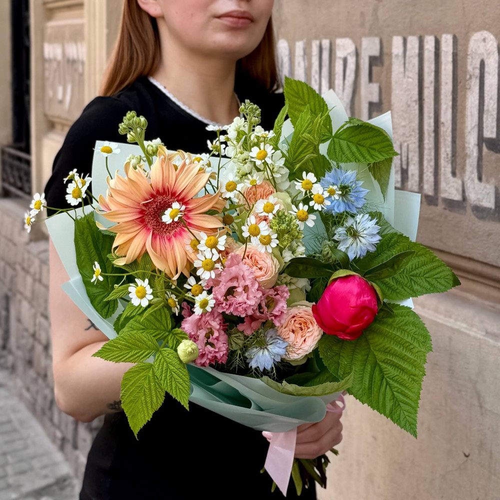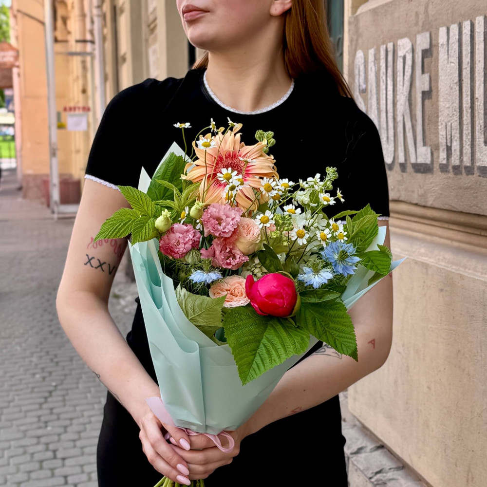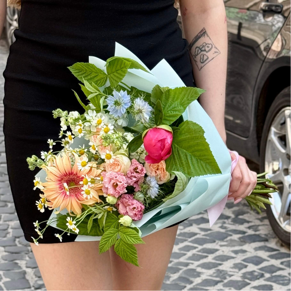 - Як замовити Кольоровий мерехтливий букет з італійською герберою Pasta Rosata та півонією Coral Sunset «Літні теплі дні»? ❯