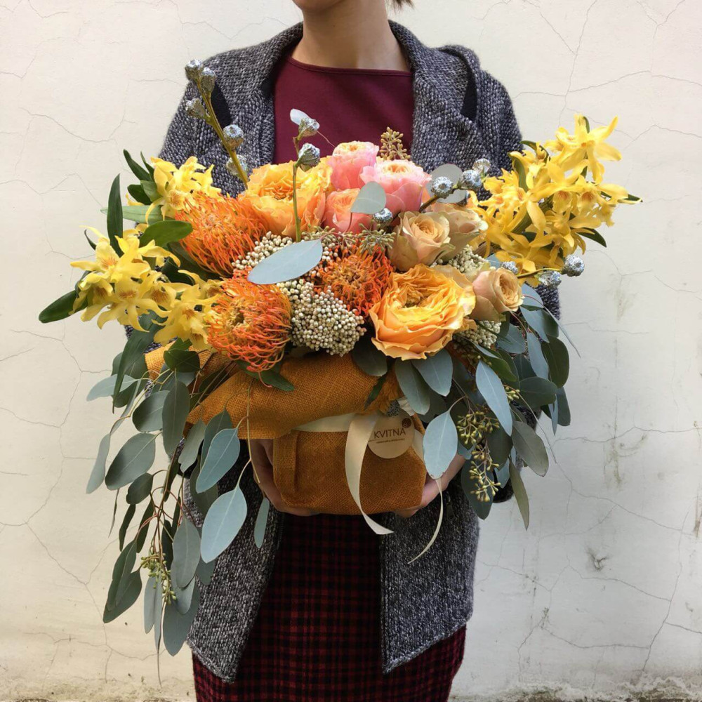 Нехай композиція (коробка, кошик, сніп) з квітами від Квітна тішить Вас якнайдовше!