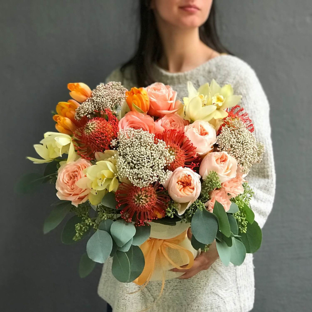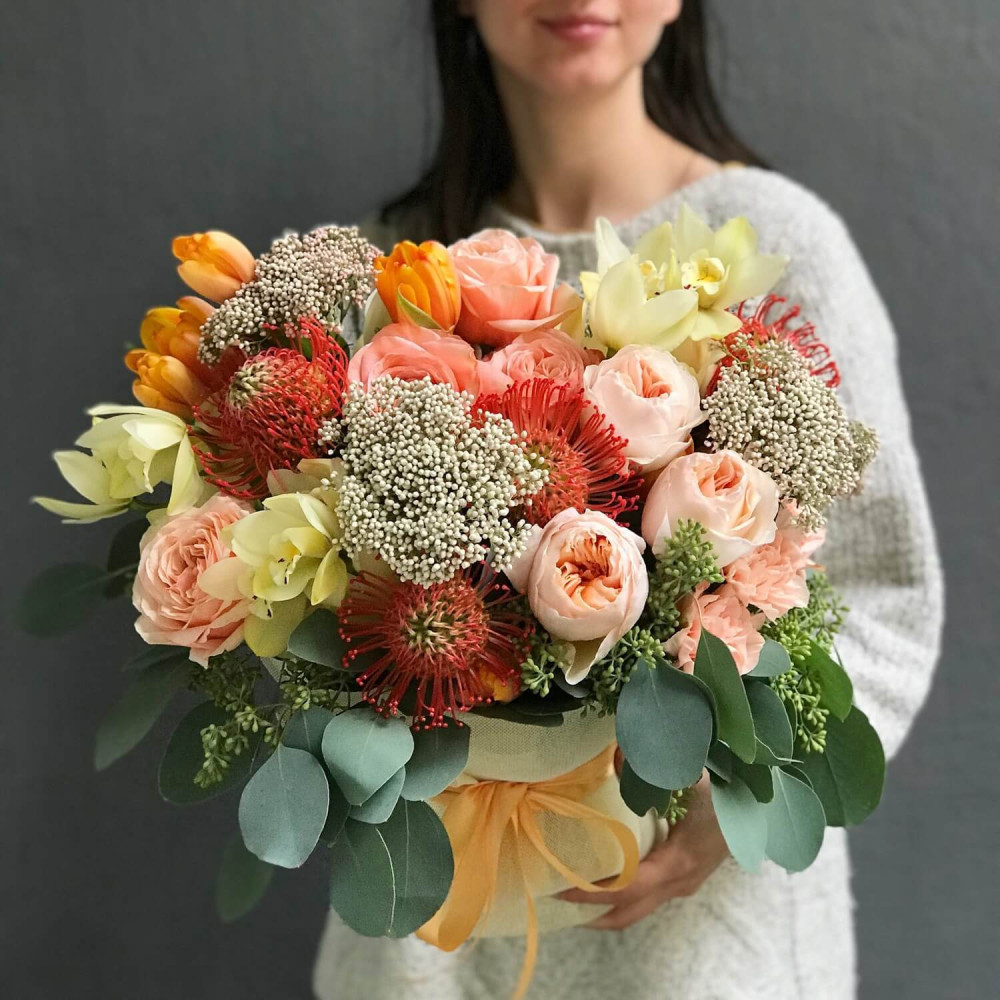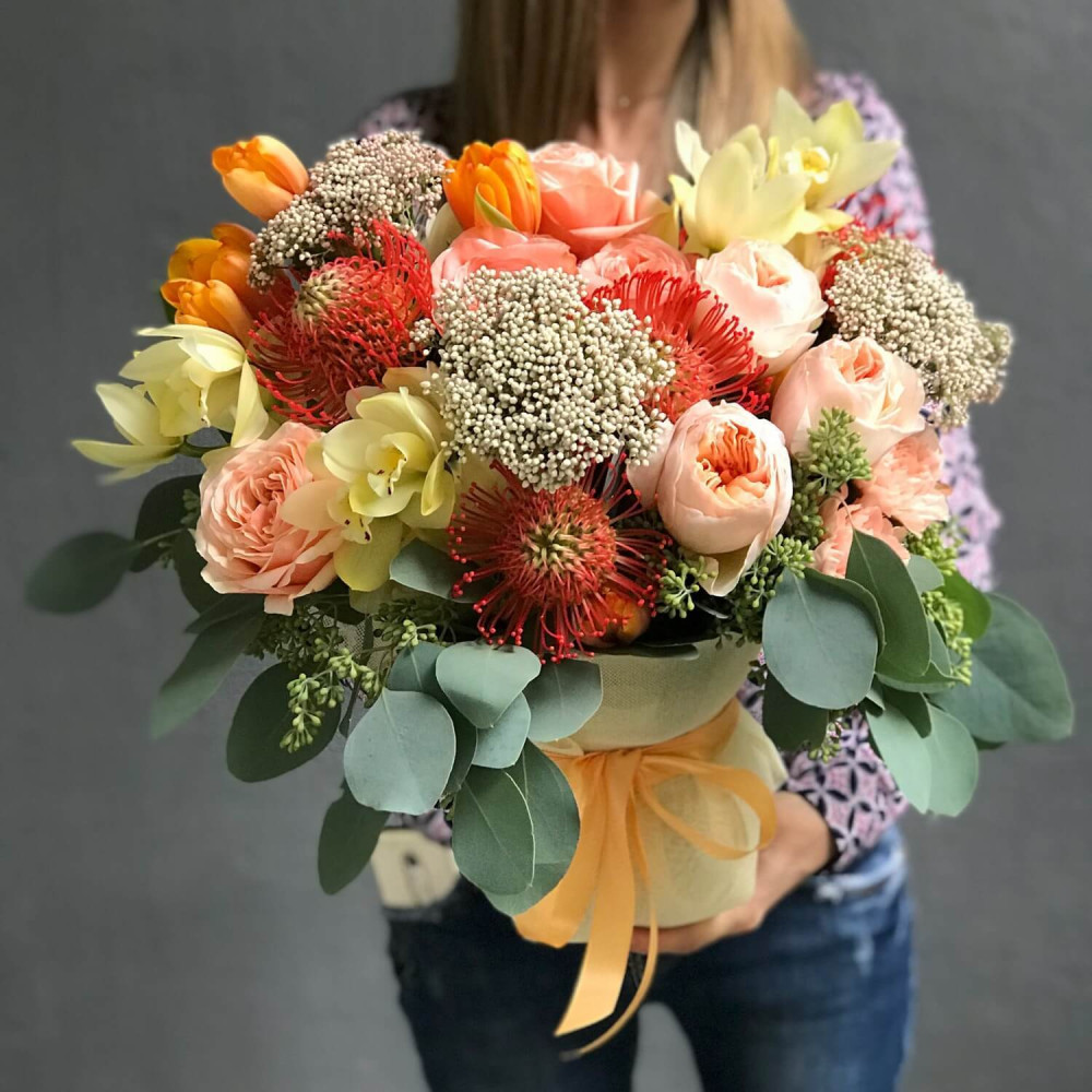Нехай композиція (коробка, кошик, сніп) з квітами від Квітна тішить Вас якнайдовше!