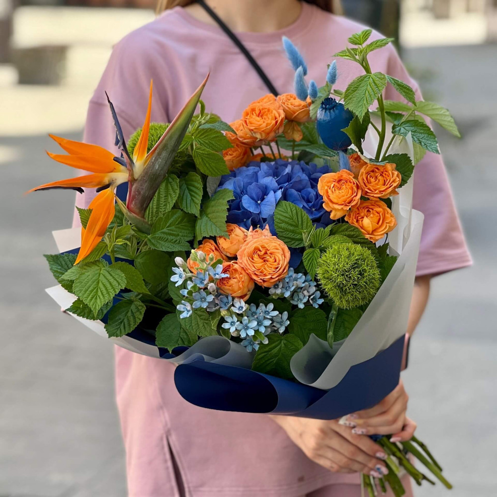 - Як замовити Контрастний букет із стреліцією «Тропічний вечір»? ❯