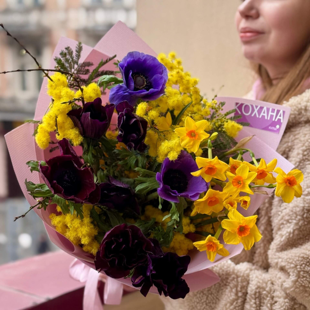 - Як замовити Контрастний букет з анемонами, нарцисами та мімозою «Шалена галявинка»? ❯