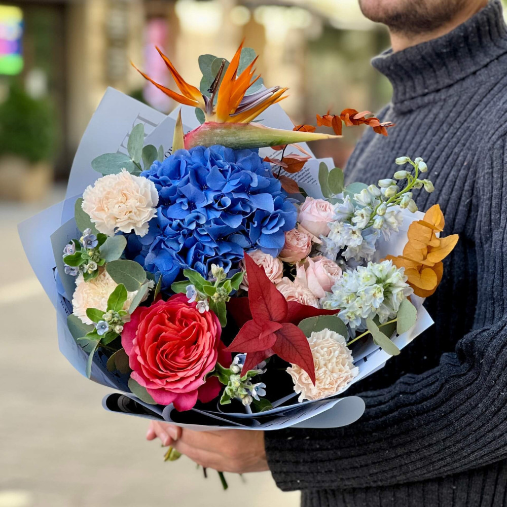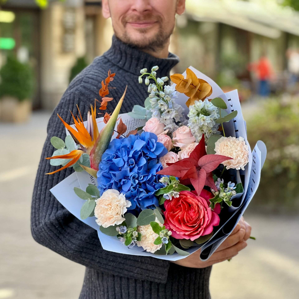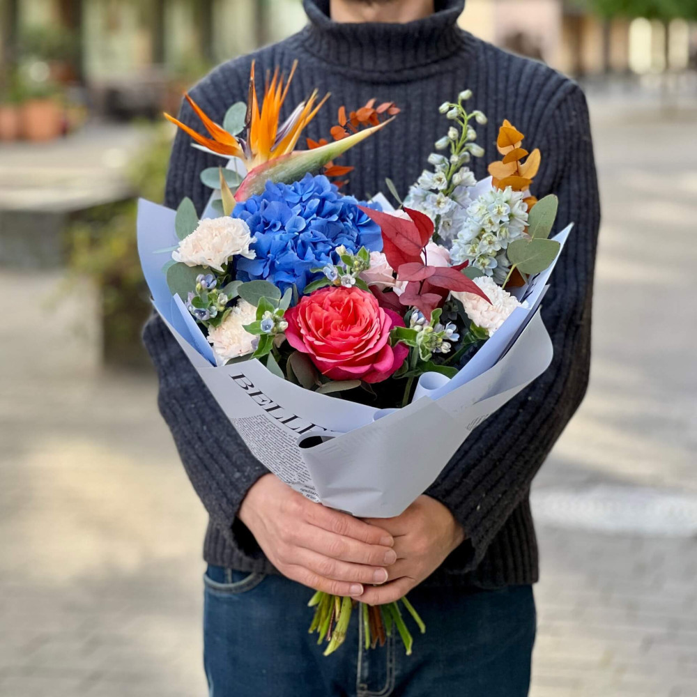 Квіти: Евкаліпт, Гортензія, Стреліція, Оксіпеталум, Троянда піоновидна кущова, Троянда піоновидна, Дельфініум, Діантус (Гвоздика)