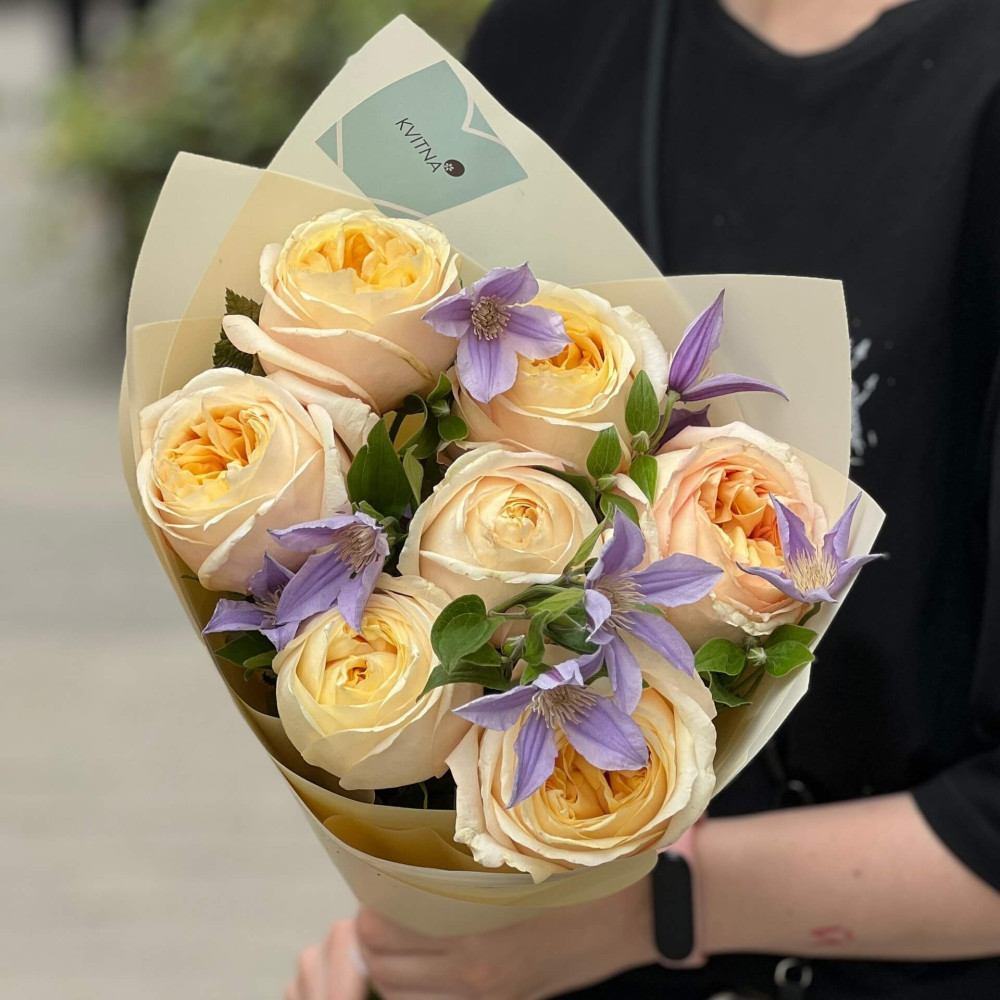 Квіти: Клематіс, Троянда піоновидна, Малина (листя)