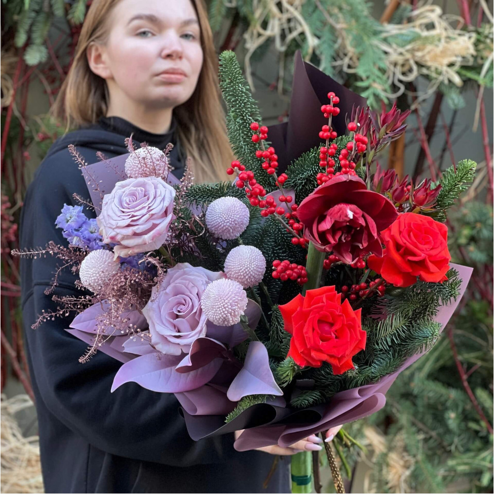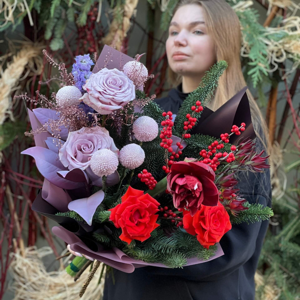 Квіти: Гіпеаструм, Троянда, Хризантема, Ілекс, Тласпі, Магнолія, Нобіліс (ялинка), Дельфініум, Леукадендрон