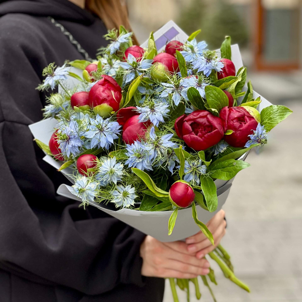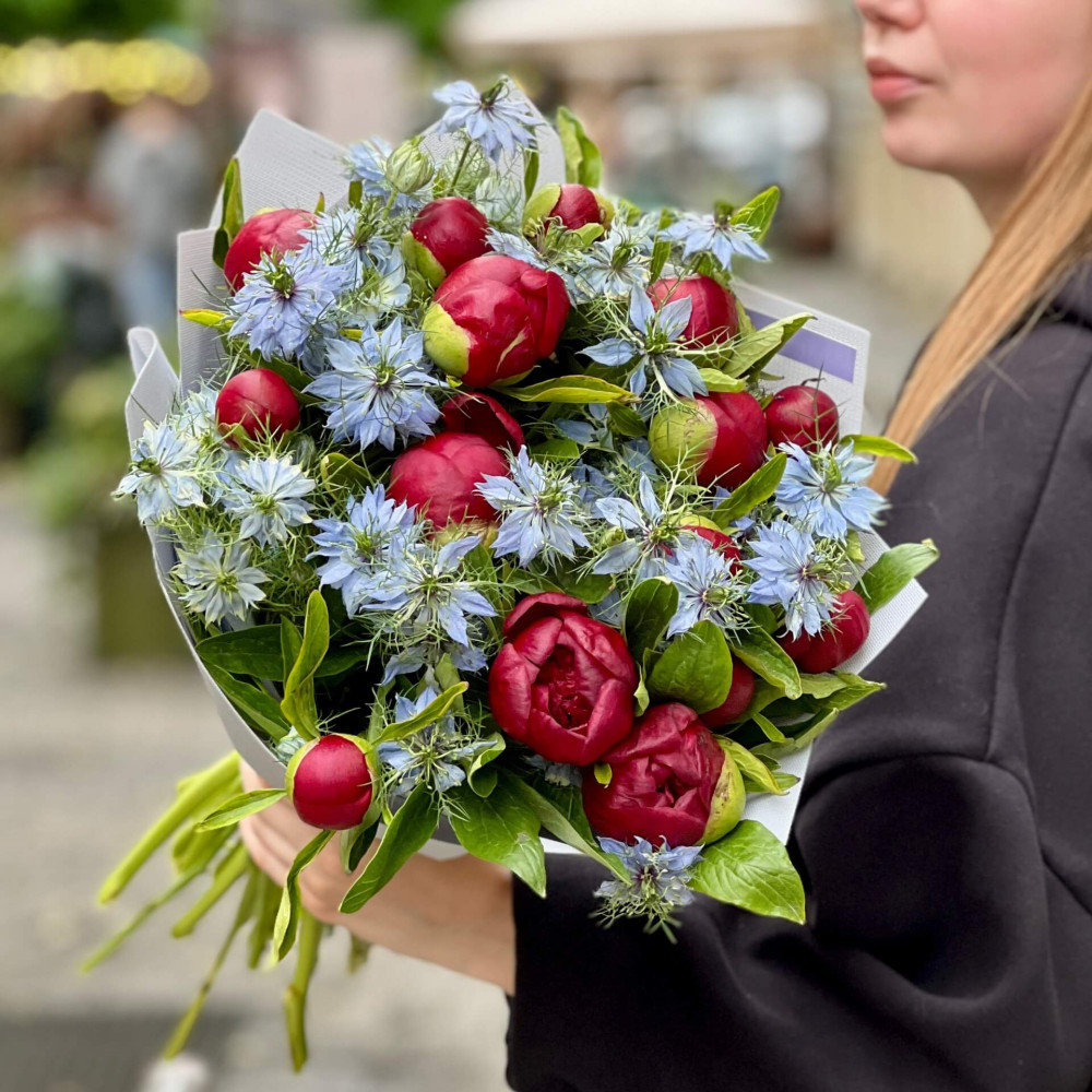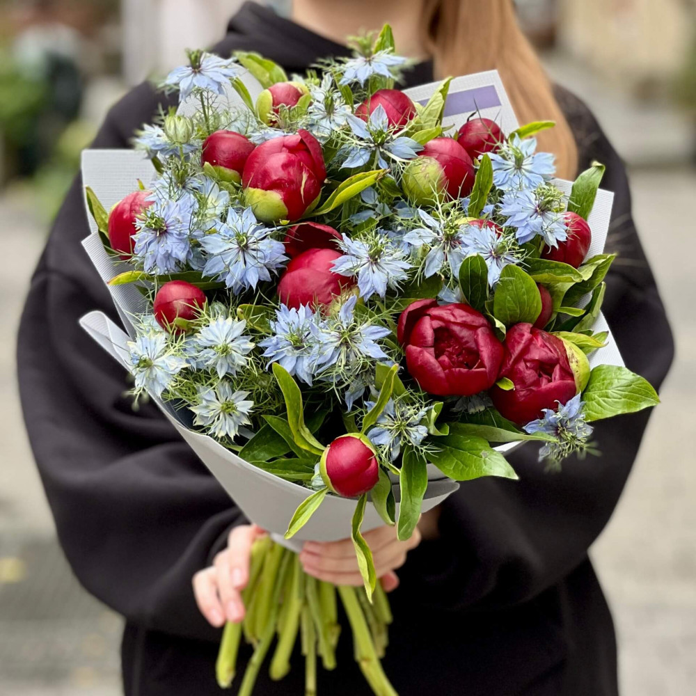 - Як замовити Контрастний букет з півоніями та нігелою «Рубінові зорі»? ❯