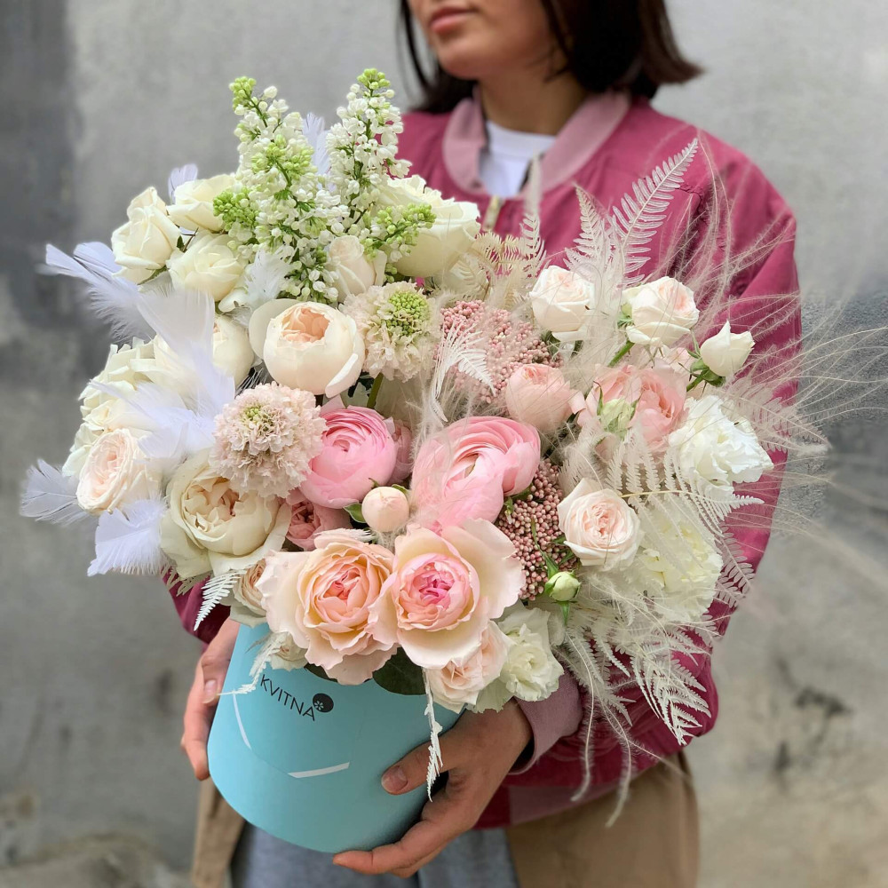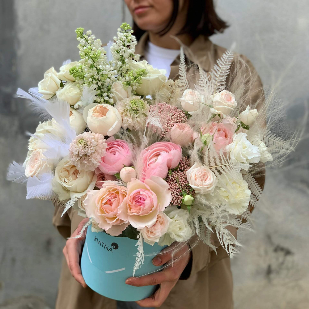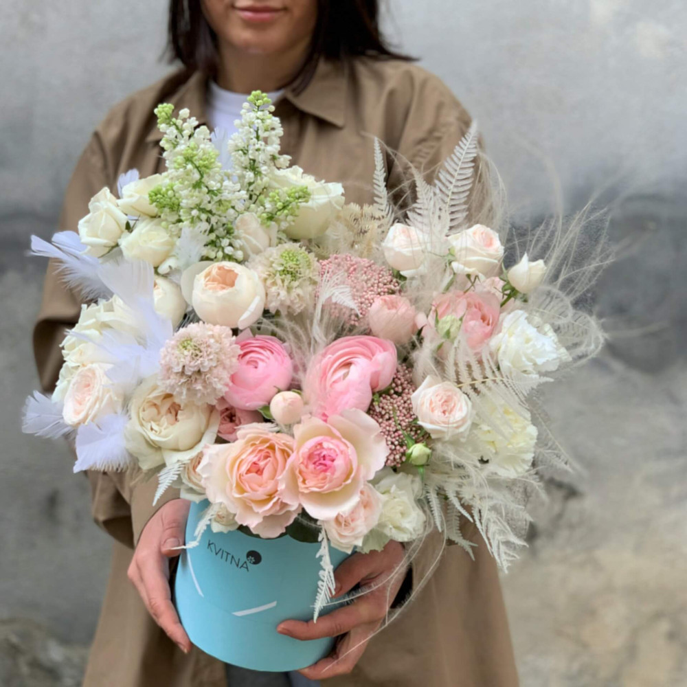 Нехай композиція (коробка, кошик, сніп) з квітами від Квітна тішить Вас якнайдовше!