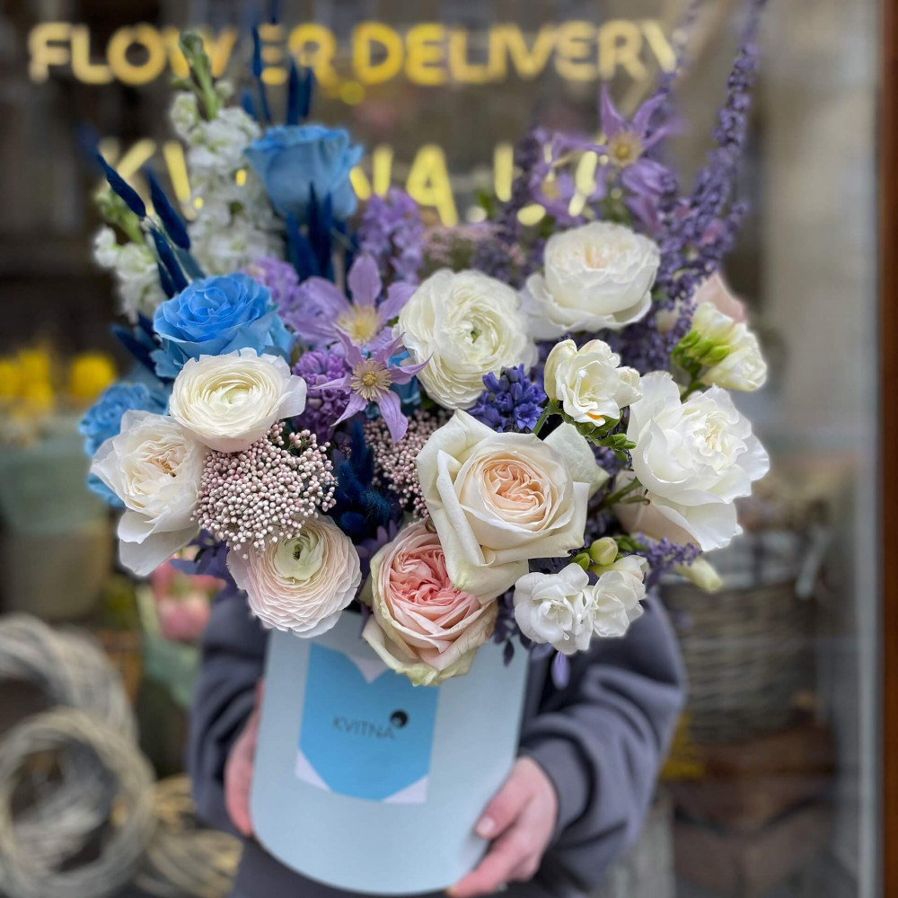 Нехай композиція (коробка, кошик, сніп) з квітами від Квітна тішить Вас якнайдовше!