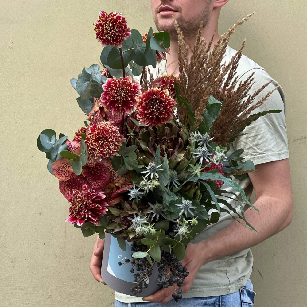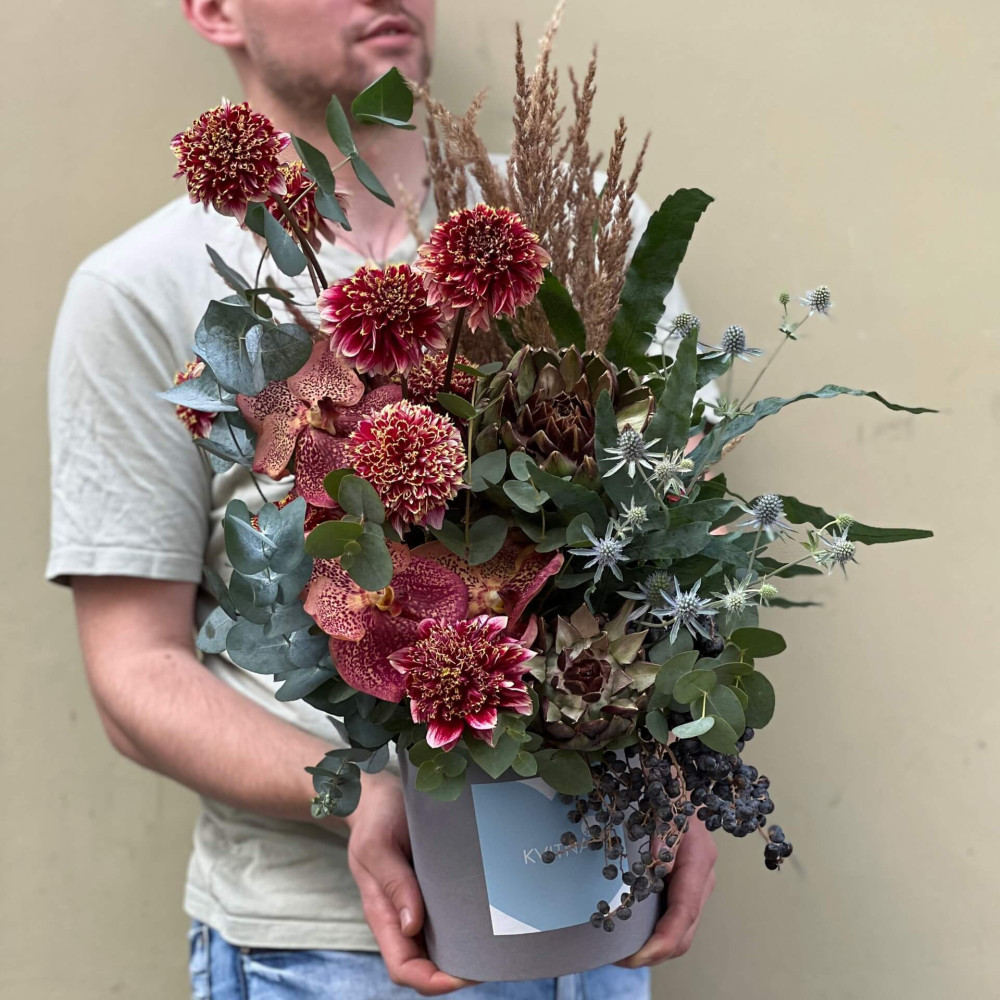 Вишуканий горіховий десерт з додаванням вишні надихнув флориста на цю композицію. Глибокий багряний колір приємно контрастує з прохолодним блакитно-сірим сатином евкаліпту та колючими іскрами синьоголовника. Композиція припаде до смаку поціновувачів природного і вільного стилю.