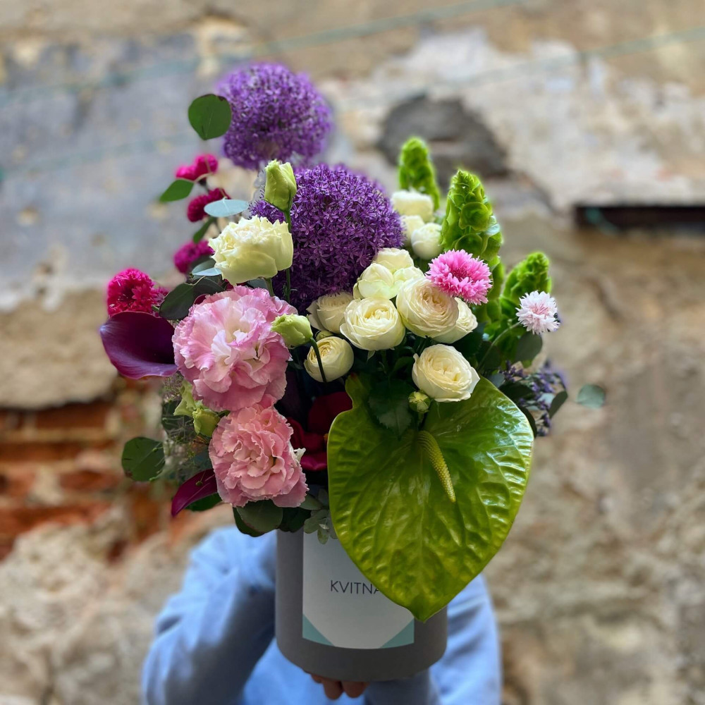 Нехай композиція (коробка, кошик, сніп) з квітами від Квітна тішить Вас якнайдовше!