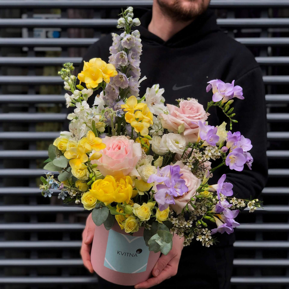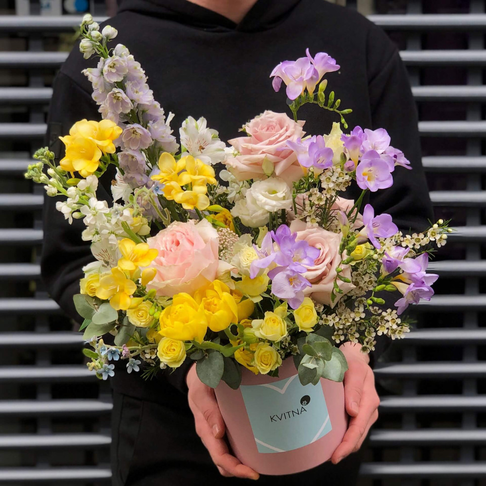 Нехай композиція (коробка, кошик, сніп) з квітами від Квітна тішить Вас якнайдовше!