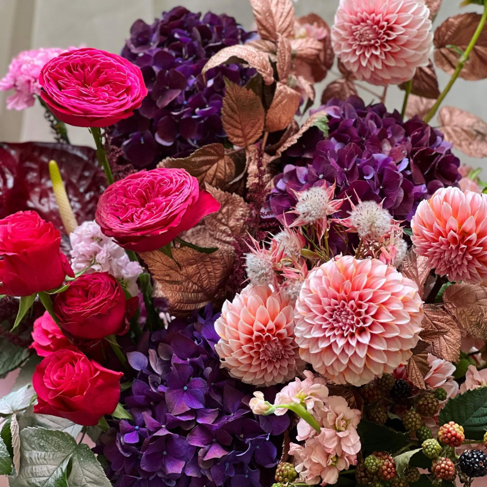 Квіти: Троянда піоновидна, Гортензія, Астільба, Матіола, Жоржина, Троянда, Антуріум, Рубус
